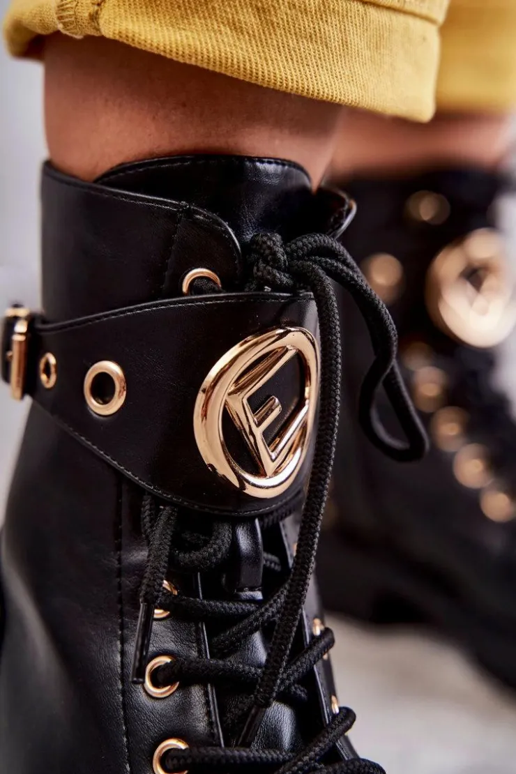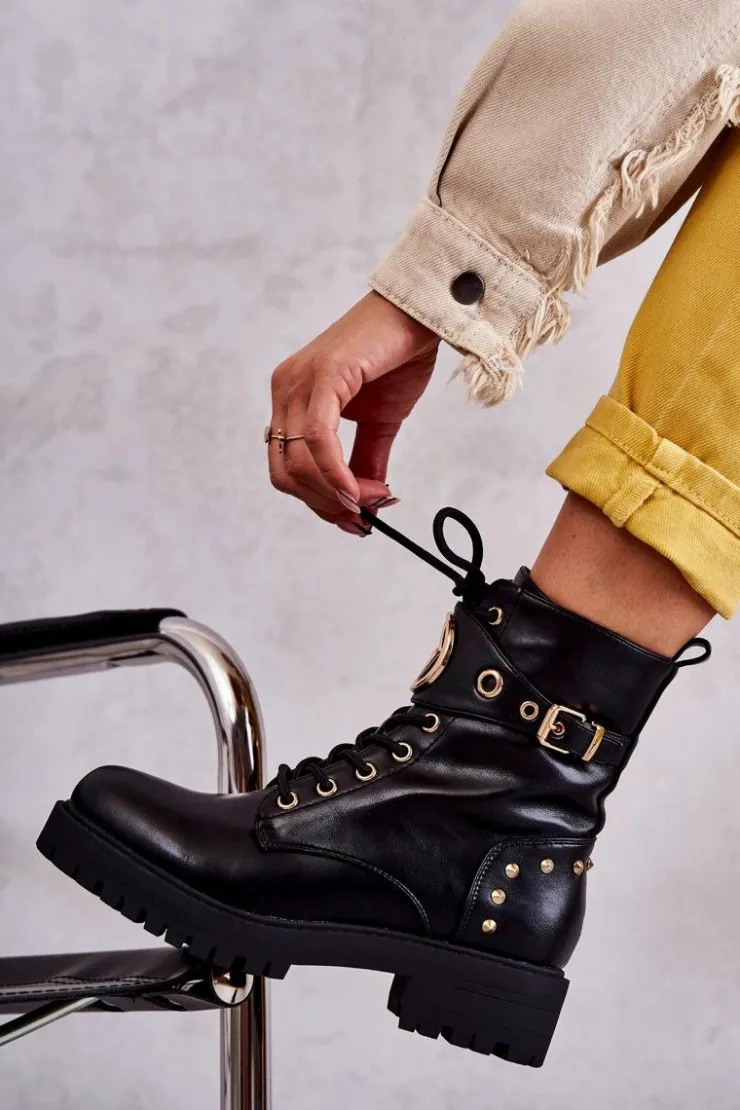Modne damskie botki świetnie sprawdzą się podczas jesiennych stylizacji! Wykonane z eko skóry. Dodatkowo zostały przyozdobione ćwiekami oraz emblematem z tworzywa sztucznego. Botki posiadają klasyczne wiązanie oraz suwak. W środku znajduje się ocieplenie w postaci koca obuwniczego. Osadzone na płaskim obcasie oraz platformie. Przy wyborze rozmiaru prosimy sugerować się tabelą rozmiarów.