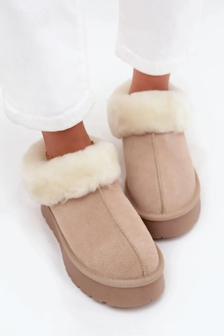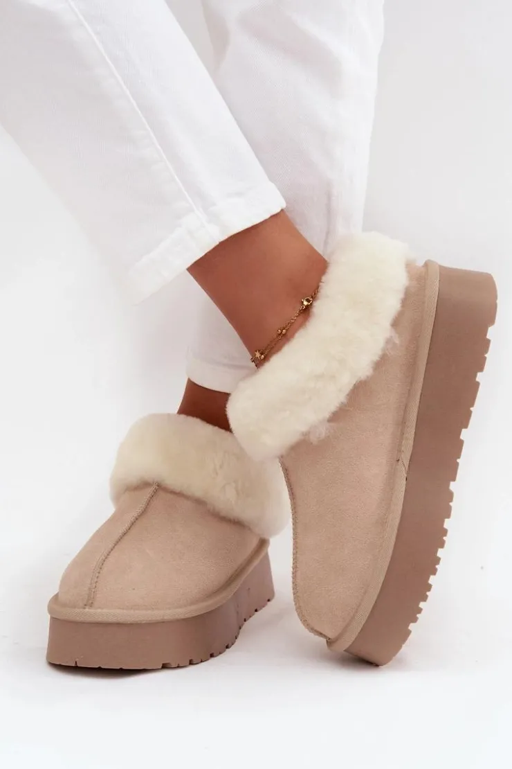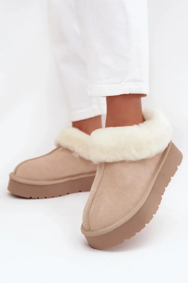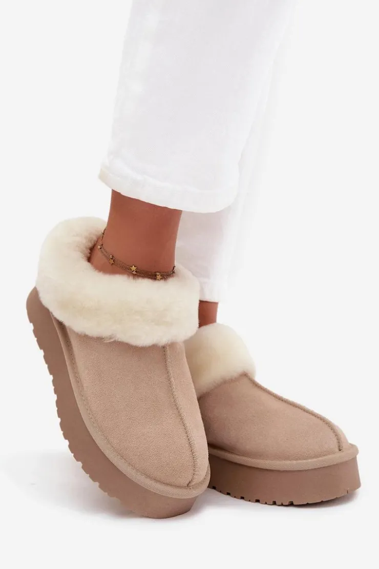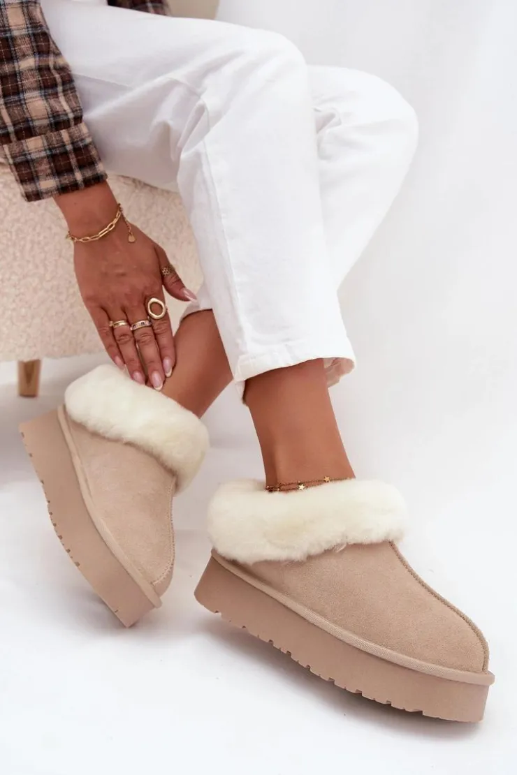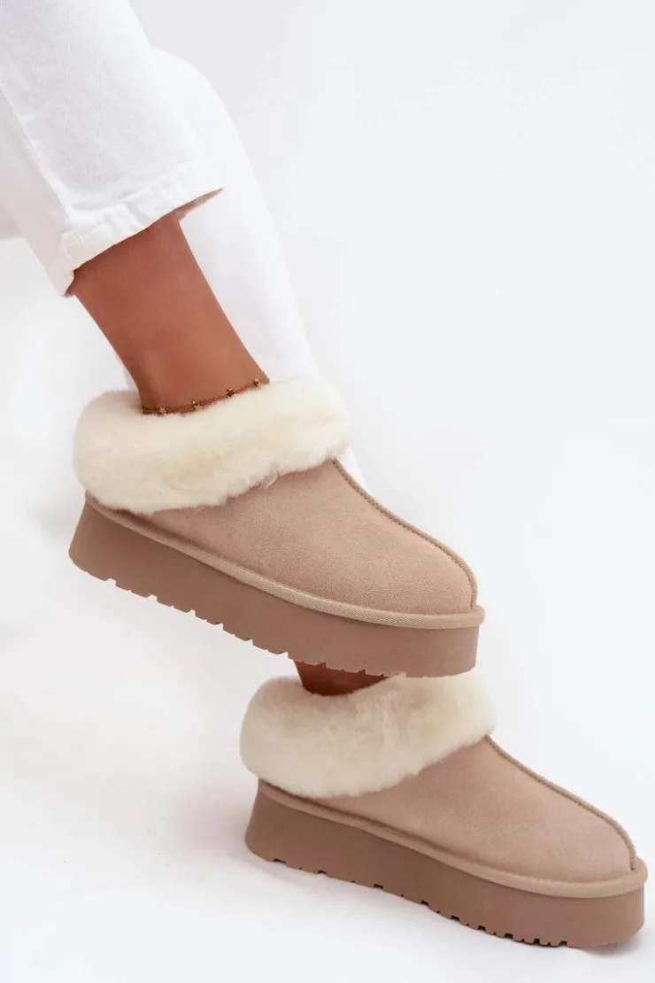 Śniegowce to niezawodne obuwie na zimowe wyjścia, które łączy styl i funkcjonalność. Wykonane z naturalnego zamszu. Osadzone na platformie z gumowego tworzywa skutecznie izolują od chłodnego podłoża, zapewniając komfort nawet podczas długich spacerów. Na górze cholewki i wewnątrz buta znajduje się miękkie futerko, które otula stopy przyjemnym ciepłem i dodaje obuwiu przytulnego, zimowego charakteru. To model, który świetnie sprawdzi się zarówno w casualowych stylizacjach z jeansami, jak i w połączeniu z legginsami.