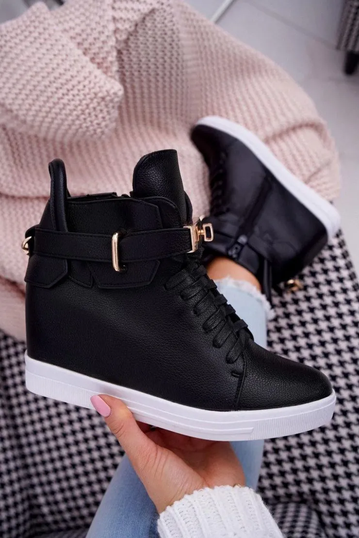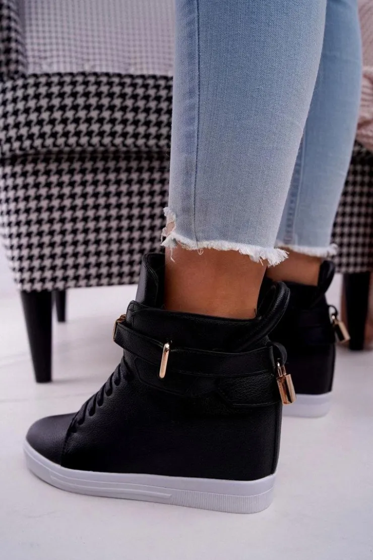 Boto Sneakersy Damskie Na Koturnie Złota Kłódka Czarne Tersey