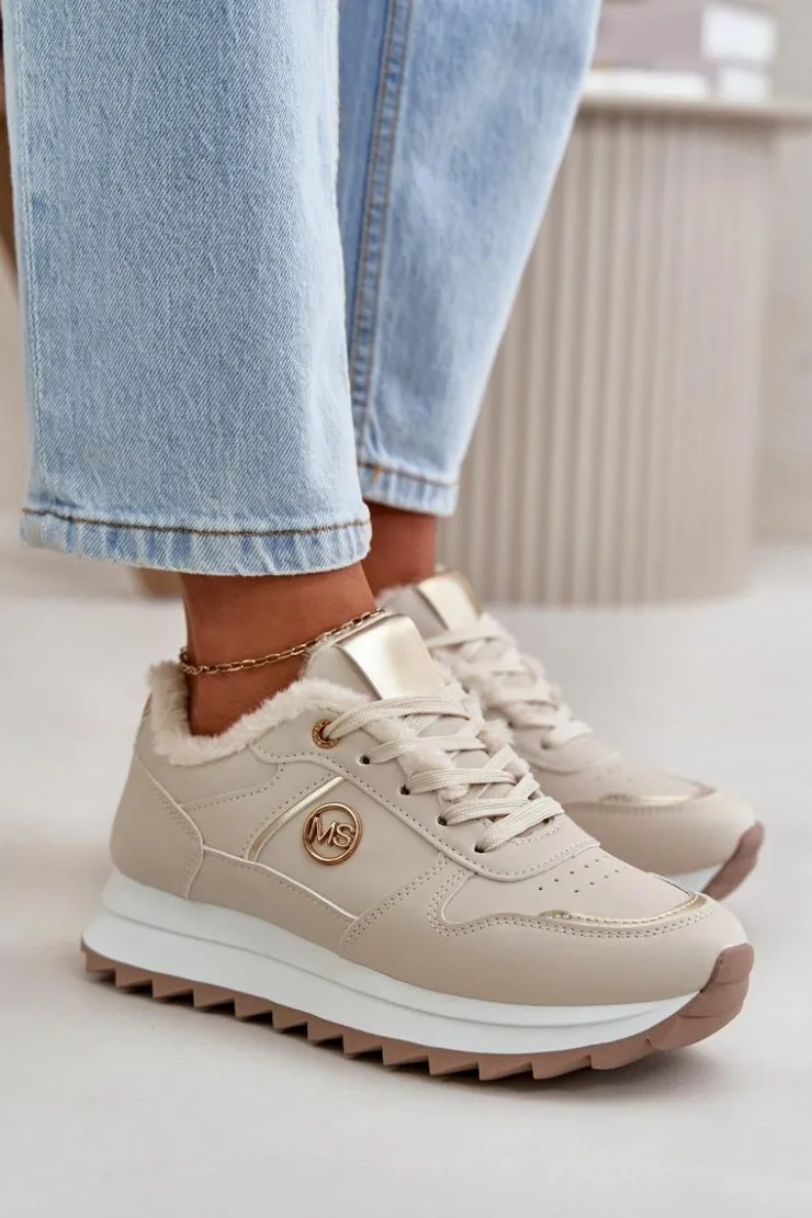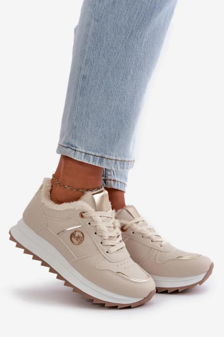 Damskie buty sportowe wykonane z eko skóry. Wnętrze ocieplone jest futerkiem, co zapewnia dodatkowy komfort i ochronę przed zimnem. Osadzone na solidnej platformie, buty te nie tylko podnoszą sylwetkę, ale także zapewniają doskonałą stabilność. Dodatkowym elementem dekoracyjnym jest złoty detal umieszczony na cholewce, który dodaje elegancji i nowoczesnego stylu. Idealne do noszenia zarówno na co dzień, jak i podczas aktywności na świeżym powietrzu. Przy wyborze rozmiaru prosimy kierować się tabelą rozmiarów.
