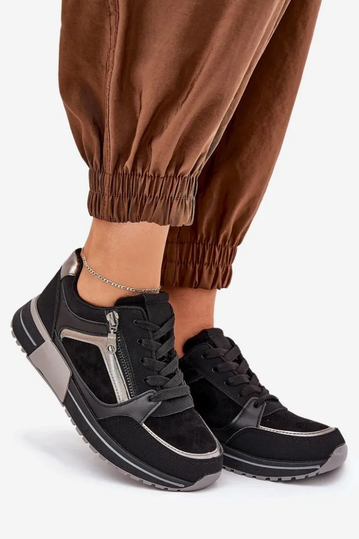 Damskie buty sportowe wykonane z połączania eko skóry i zamszu. Osadzone na platformie, z zaokrąglonymi noskami, zapewniają komfort i stabilność na każdym kroku. Cholewka ozdobiona suwakiem dodaje im nowoczesnego charakteru. Wkładka z miękkiej pianki, dodatkowo pokryta materiałem, gwarantuje maksymalną wygodę podczas codziennego użytkowania. Idealne do sportowych i casualowych stylizacji! Przy wyborze rozmiaru prosimy kierować tabelą rozmiarów.