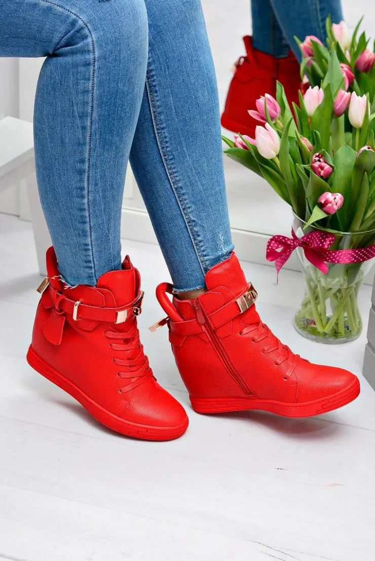 Boto Sneakersy Damskie*Damskie Czerwone Sneakersy Złota Kłódka Koturn Hudgens