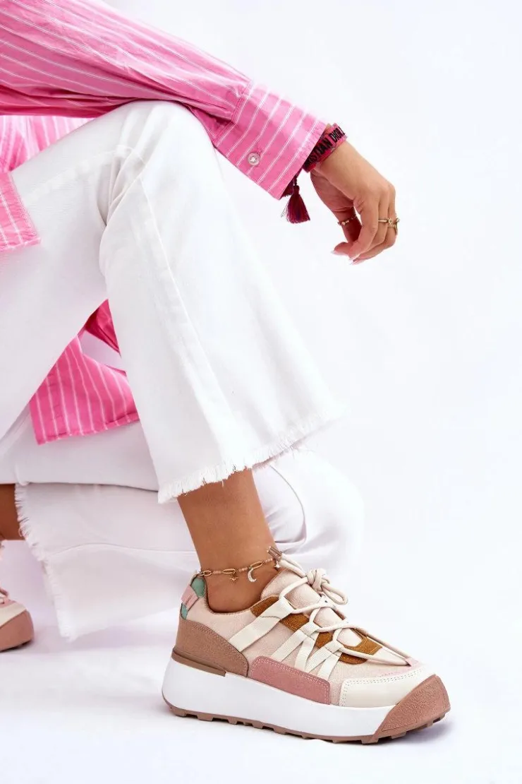 Damskie buty sportowe wykonane z eko zamszu. Zostały osadzone na masywnej platformie, która delikatnie uniesie Twoją sylwetkę. Model ten posiada klasyczne sznurowanie, które pozwoli na odpowiednie dopasowanie obuwia do tęgości nogi. Dodatkowo zapiętek jest usztywniany, a wkładka w tych butach jest wymienna. Przy wyborze rozmiaru prosimy kierować się tabelą rozmiarów.