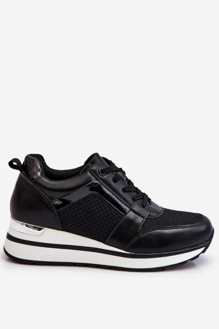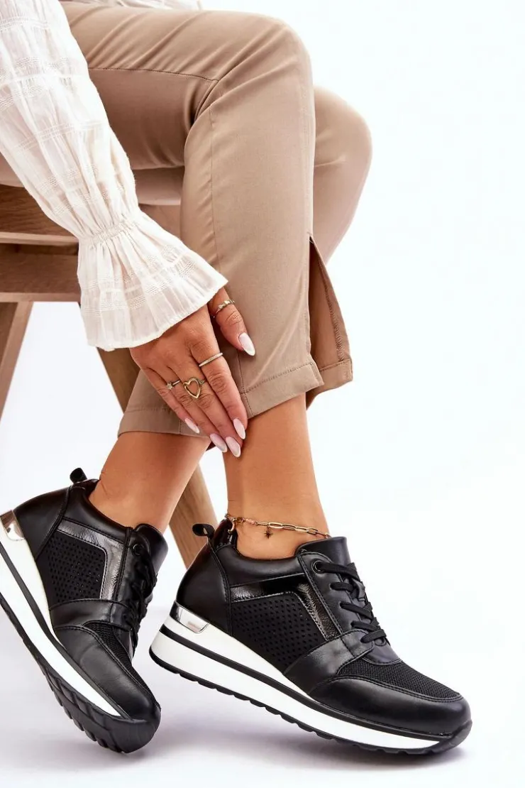 Wygodne sneakersy wykonane z eko skóry z delikatną perforacją po bokach cholewki oraz wstawką z przodu z materiału. Model klasycznie sznurowany. Buty zostały osadzone na platformie oraz niewysokim koturnie. Miękka wkładka zapewni komfortowe użytkowanie obuwia nawet przez cały dzień! Przy wyborze rozmiaru prosimy kierować się tabelą rozmiarów.