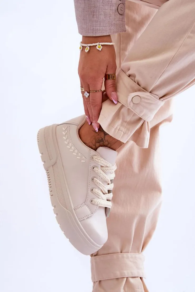 Świetne sportowe buty damskie zostały wykonane z eko skóry. Posiadają ozdobne przeszycie z boku cholewki. Model ten posiada charakterystyczne sznurówki z szyciem w kształcie kłosa. Dodatkowo model ten posiada wyjmowaną wkładkę wykonaną z materiału. Sneakersy osadzono na masywnej platformie z tworzywa sztucznego. Przy wyborze rozmiaru prosimy kierować tabelą rozmiarów.