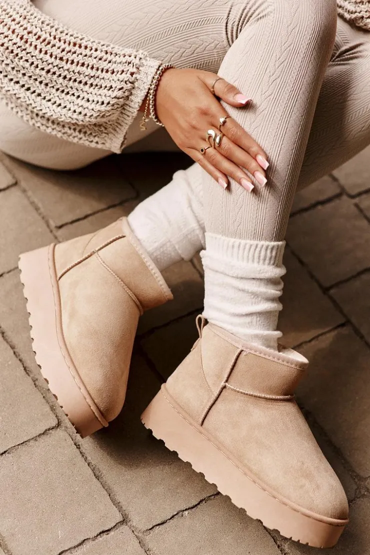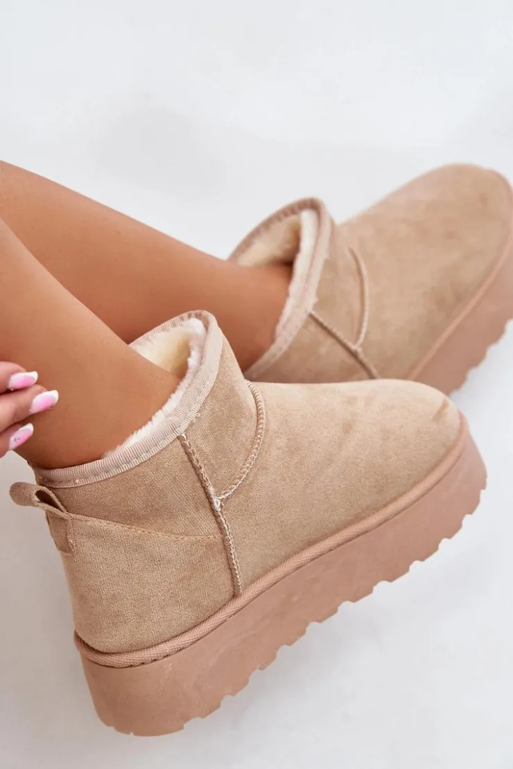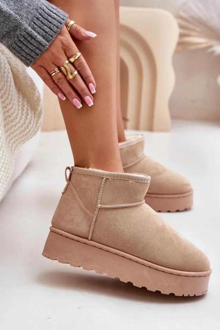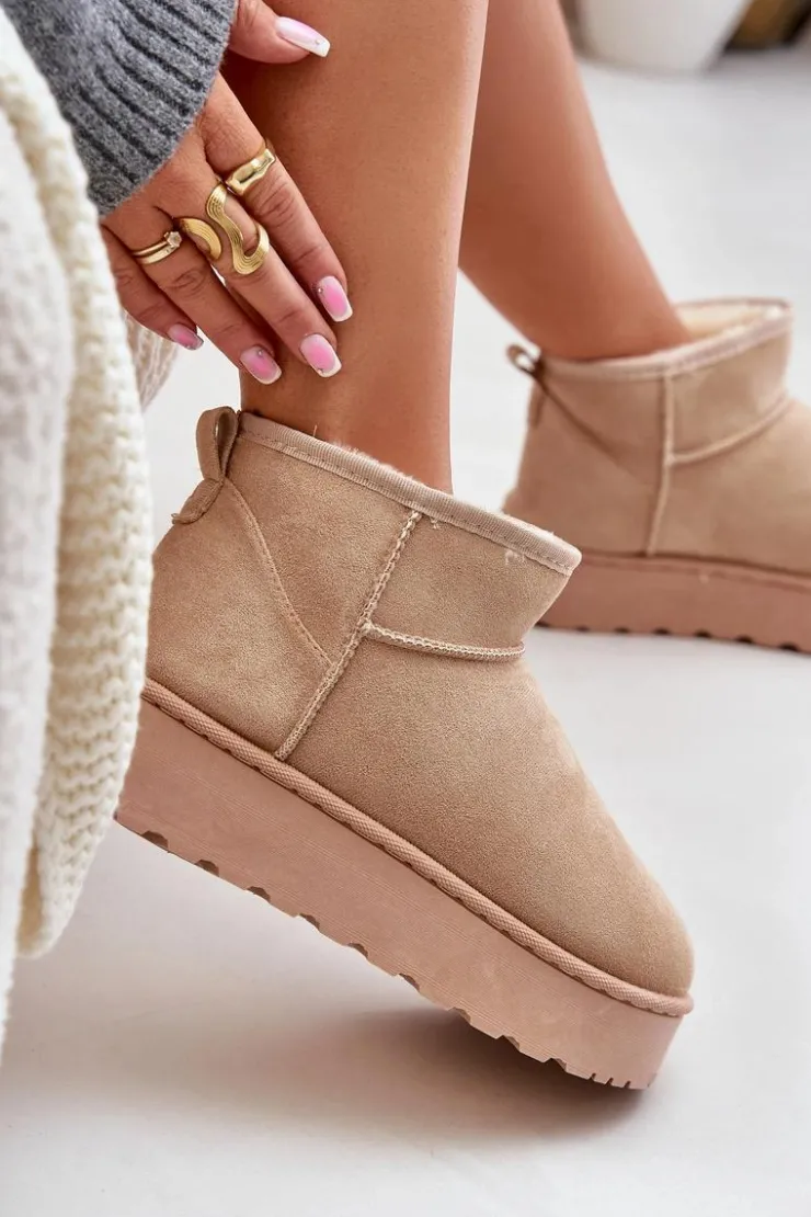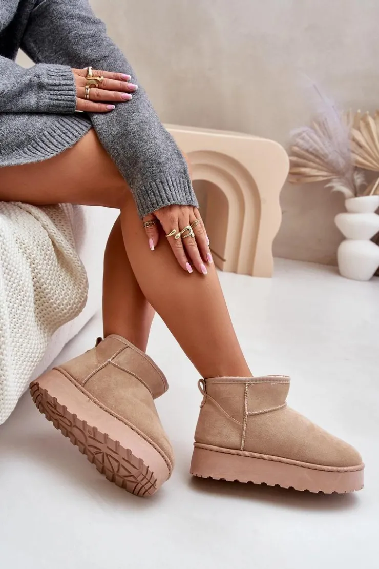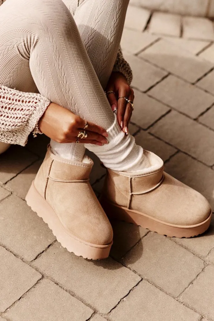 Modne śniegowce z cholewką za kostkę. Wewnątrz ocieplone grubym, syntetycznym futerkiem. Wykonane z eko zamszu. Osadzone na grubej platformie z gumowego tworzywa, która świetnie odizoluje od zimnego podłoża. Idealnie sprawdzą się podczas mroźnych dni. Modny od kilku sezonów fason świetnie wpasuje się w jesienno-zimowe stylizacje! Model ten dostępny jest również w rozmiarach dziecięcych. Stwórz komplet mama + dziecko! Przy wyborze rozmiaru prosimy sugerować się tabelą rozmiarów.