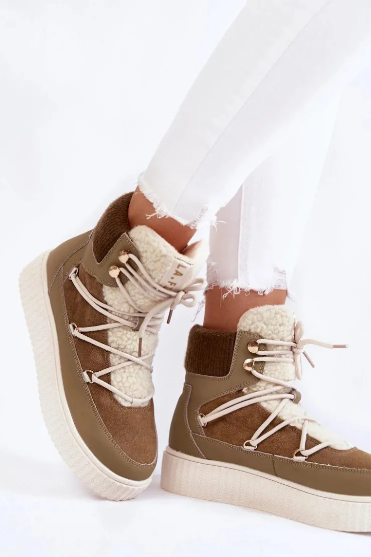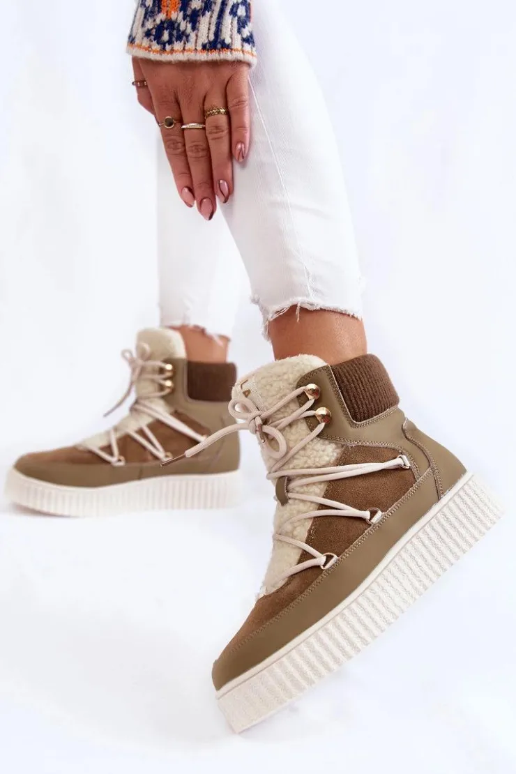 Damskie botki — śniegowce świetnie sprawdzą się w chłodniejsze dni! Wykonane z połączenia naturalnego zamszu oraz eko skóry. Osadzone na masywnej platformie. Posiadają klasyczne sznurowanie. Cholewka zakończona ściągaczem, co pozwoli na odpowiednie dopasowanie do tęgości nogi. Dodatkowo botki posiadają usztywniany zapiętek. Ocieplone wewnątrz miłym w dotyku, delikatnym futerkiem. Przy wyborze rozmiaru prosimy sugerować się tabelą rozmiarów.