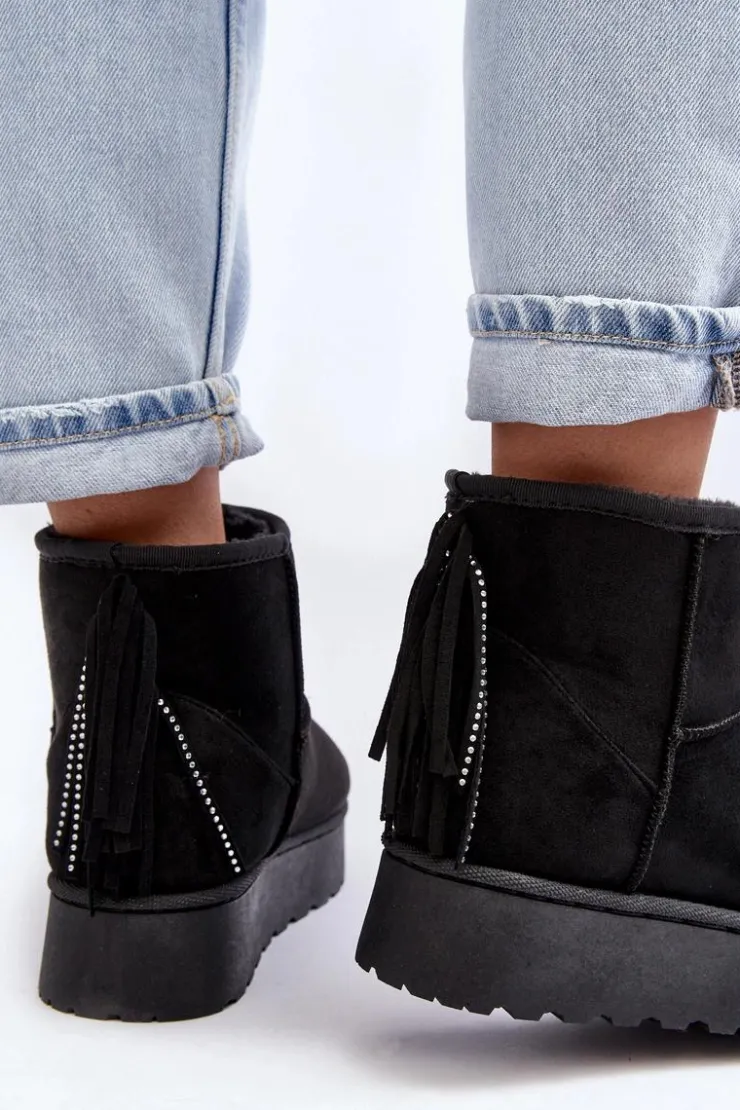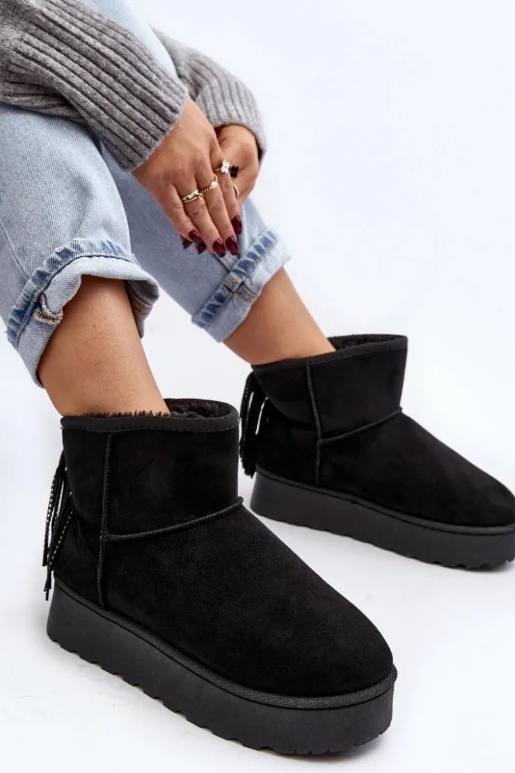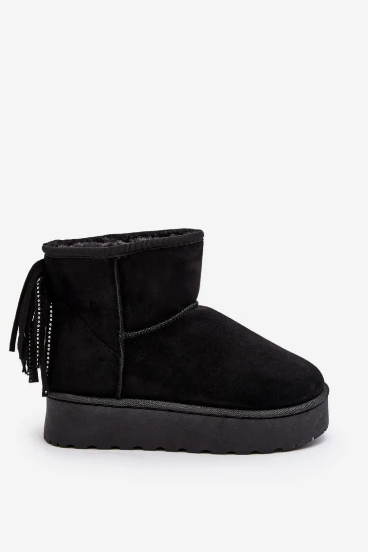 Damskie śniegowce wykonane z eko zamszu. Osadzone na masywnej podeszwie z gumowego tworzywa. Cholewka za kostkę ozdobiona frędzlami z tyłu. Środek ocieplony grubym futerkiem. Model ten występuje również w rozmiarówce dziecięcej. Stwórz komplet mama + dziecko! Przy wyborze rozmiaru prosimy sugerować się tabelą rozmiarów.
