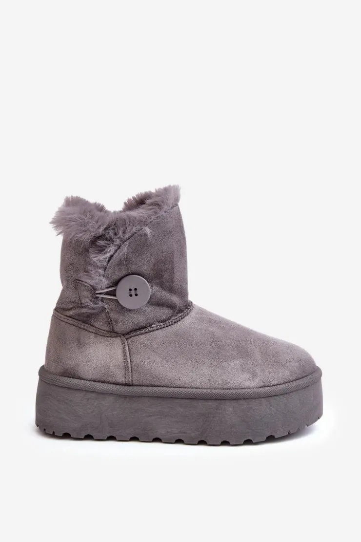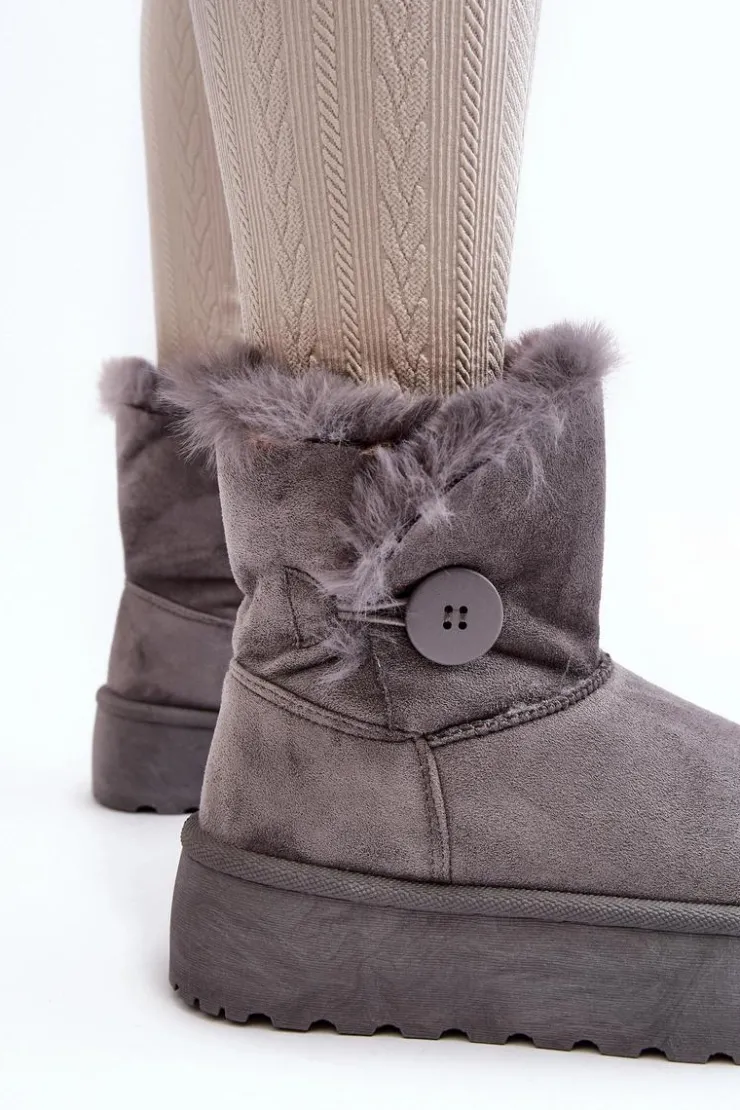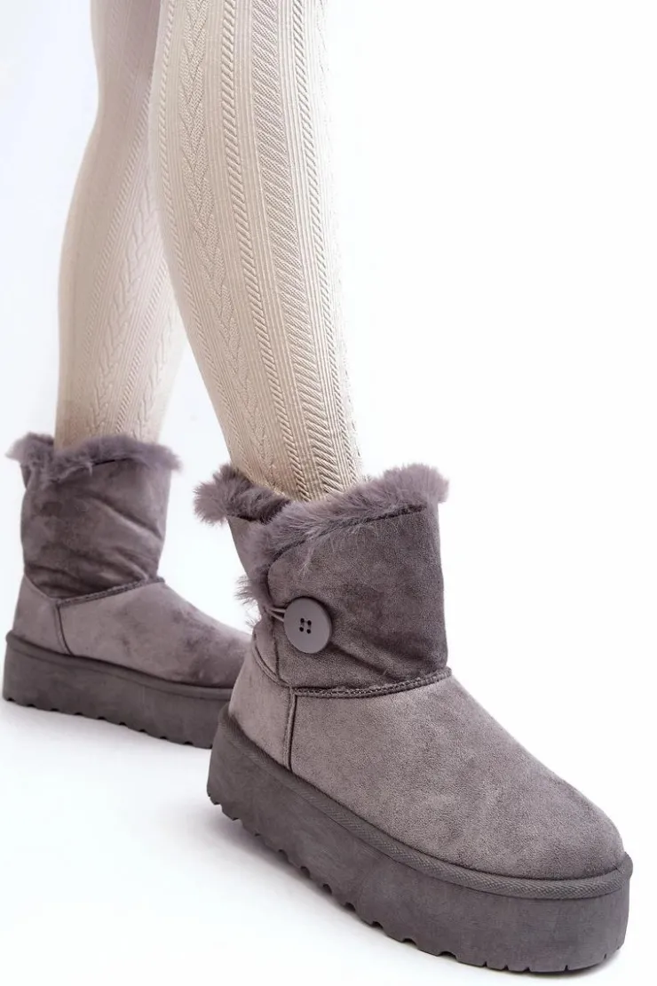 Śniegowce damskie osadzone na grubej platformie z gumowego tworzywa. Cholewka za kostkę, ozdobiona guzikiem i futerkiem. Wykonane z eko zamszu. Środek ocieplony. Ten modny model świetnie sprawdzi się w sezonie jesienno-zimowym. Koniecznie musisz je mieć! Przy wyborze rozmiaru prosimy sugerować się tabelą rozmiarów.