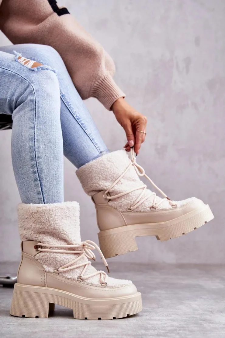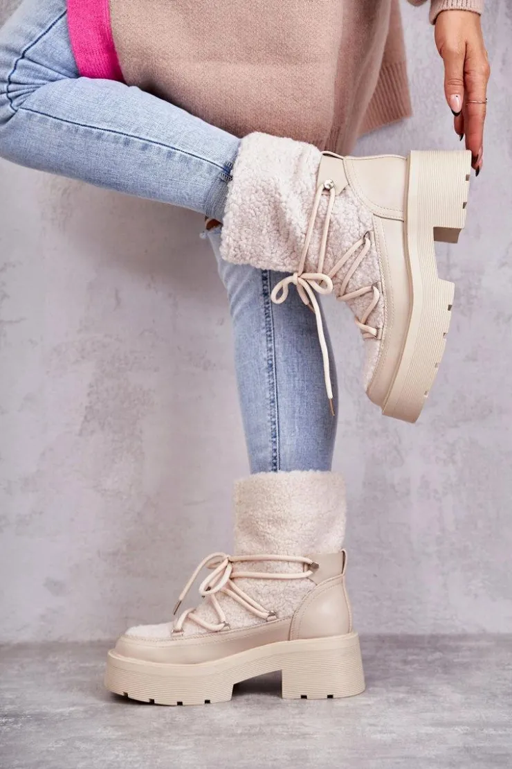 Cudowne botki w formie śniegowców zostały wykonane z materiału przypominającego kożuszek oraz eko skóry. Model klasycznie sznurowany. Botki zostały osadzone na płaskim obcasie i masywnej platformie. Posiadają w środku ocieplenie w postaci koca obuwniczego. Antypoślizgowa podeszwa zapewni stabilność na każdym kroku! Przy wyborze rozmiaru prosimy sugerować się tabelą rozmiarów.