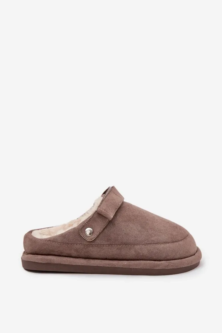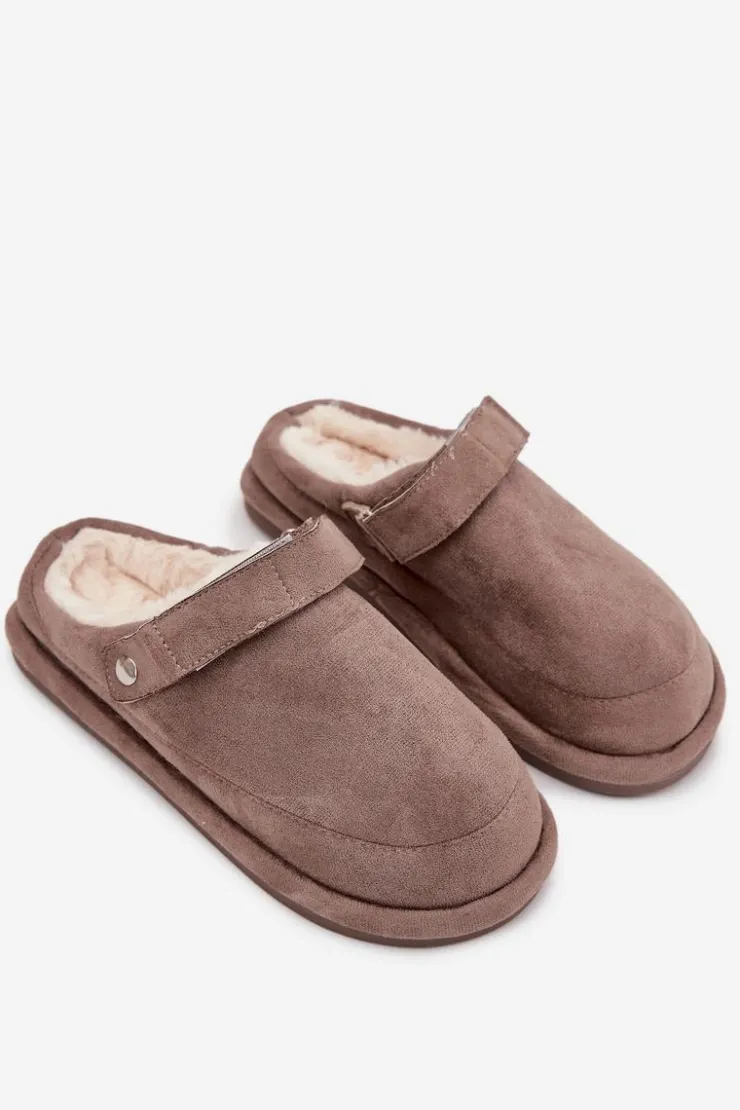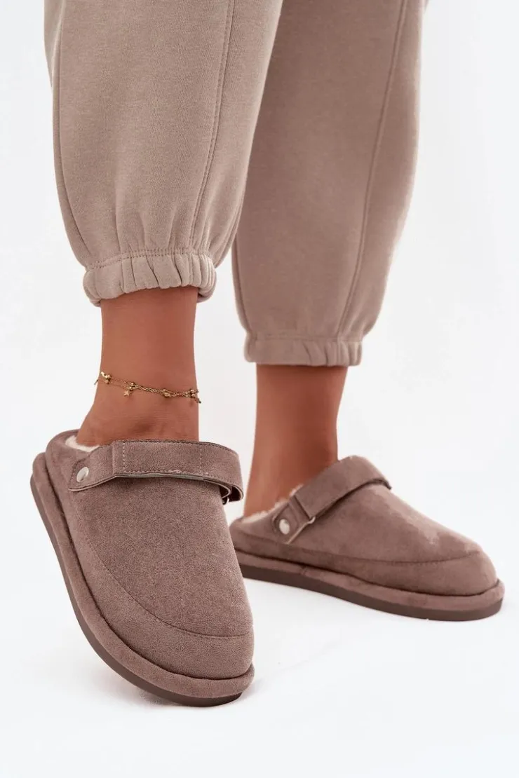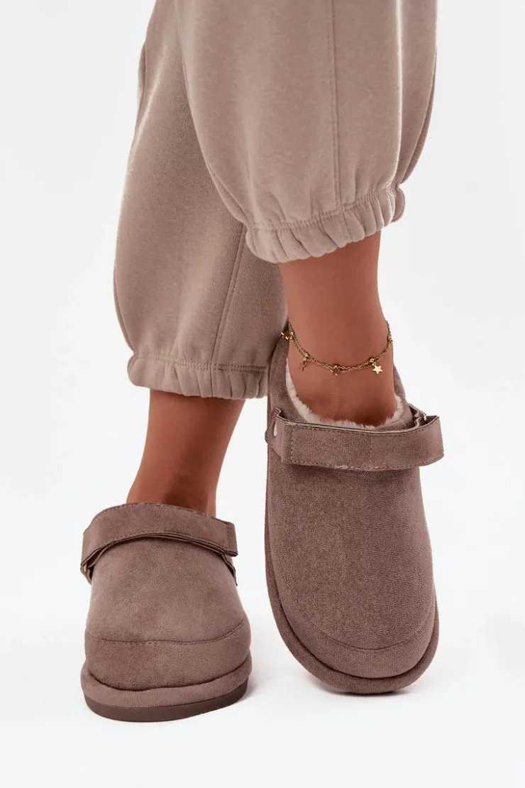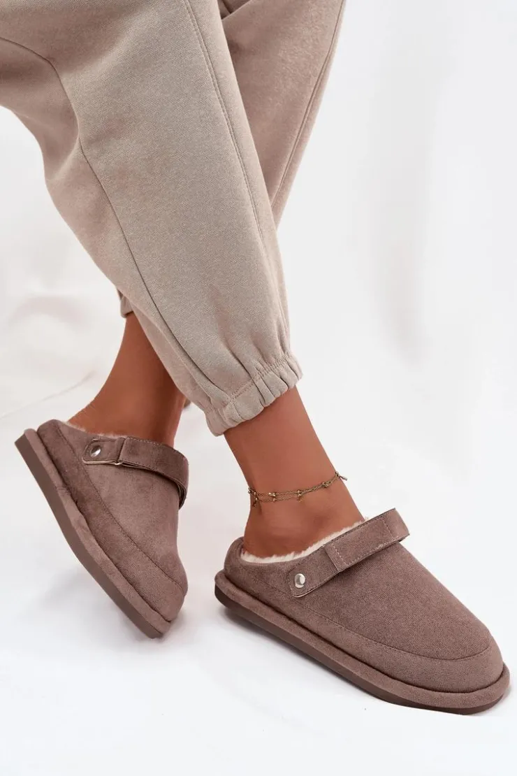 Damskie kapcie wykonane z miękkiej eko zamszowej tkaniny to wygodna i praktyczna propozycja na chłodniejsze dni. Posiadają podeszwę z gumowego tworzywa, która zapewnia stabilność i wygodę podczas chodzenia po domu. Zaokrąglone, zakryte noski podkreślają klasyczny wygląd obuwia, a ruchomy pasek zapinany na rzep ułatwia dopasowanie do stopy i dodaje funkcjonalności. Wnętrze ocieplone miękkim futerkiem gwarantuje ciepło i przyjemne otulenie, dzięki czemu kapcie idealnie sprawdzą się w domowym użytkowaniu.