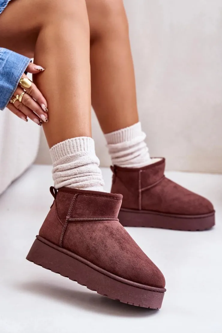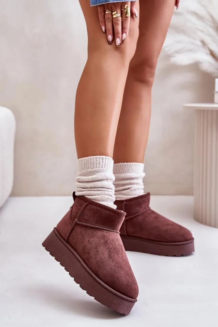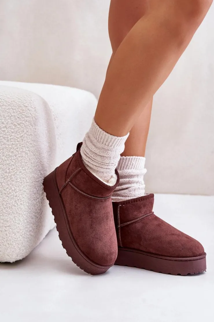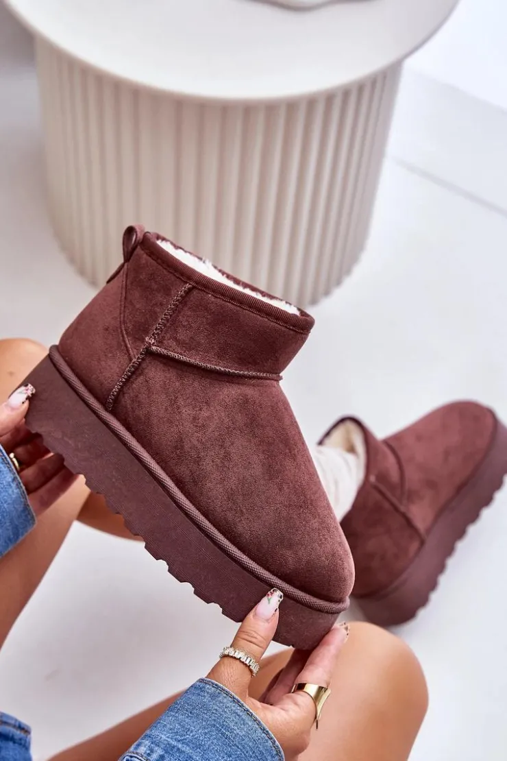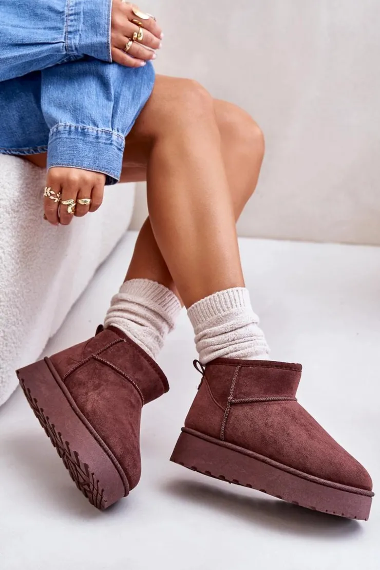 Modne śniegowce z cholewką za kostkę. Wewnątrz ocieplone grubym, syntetycznym futerkiem. Wykonane z eko zamszu. Osadzone na grubej platformie z gumowego tworzywa, która świetnie odizoluje od zimnego podłoża. Idealnie sprawdzą się podczas mroźnych dni. Modny od kilku sezonów fason świetnie wpasuje się w jesienno-zimowe stylizacje! Model ten dostępny jest również w rozmiarach dziecięcych. Stwórz komplet mama + dziecko! Przy wyborze rozmiaru prosimy sugerować się tabelą rozmiarów.
