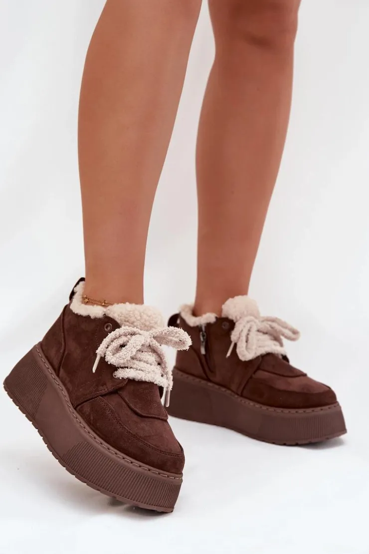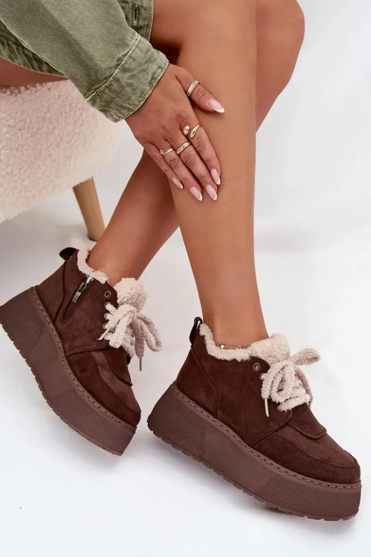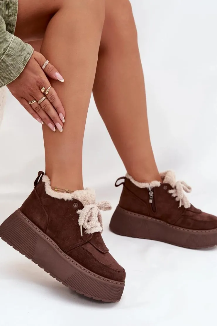 Zimowe dni nie muszą oznaczać rezygnacji ze stylu – te damskie śniegowce z eko zamszu łączą modny wygląd z funkcjonalnością. Masywna platforma chroni przed chłodem od podłoża, a futerko typu baranek gwarantuje ciepło i wygodę nawet w mroźne dni. Dzięki połączeniu zamka i sznurowania buty świetnie trzymają się na nodze i łatwo je zakładać. To idealny wybór na co dzień – komfortowe, praktyczne i pełne zimowego uroku. Przy wyborze rozmiaru prosimy sugerować się tabelą rozmiarów.