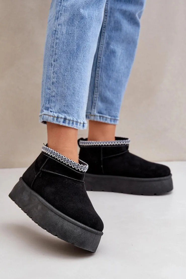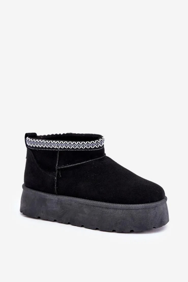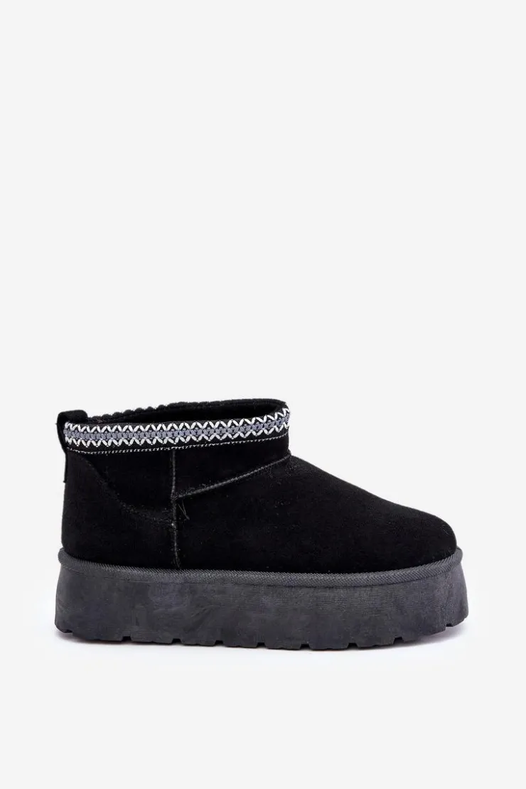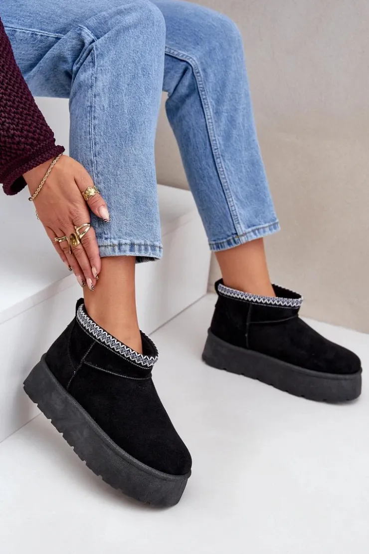 Stylowe śniegowce damskie wykonane z eko zamszu. Osadzone na platformie, która skutecznie izoluje od zimnego podłoża. Wnętrze butów ocieplane miękkim futerkiem, zapewniającym ciepło i komfort w mroźne dni. Górę cholewki zdobi subtelny haft, dodający wyjątkowego uroku. Idealny wybór na zimowe spacery i codzienne aktywności w chłodne dni! Przy wyborze rozmiaru prosimy kierować tabelą rozmiarów.