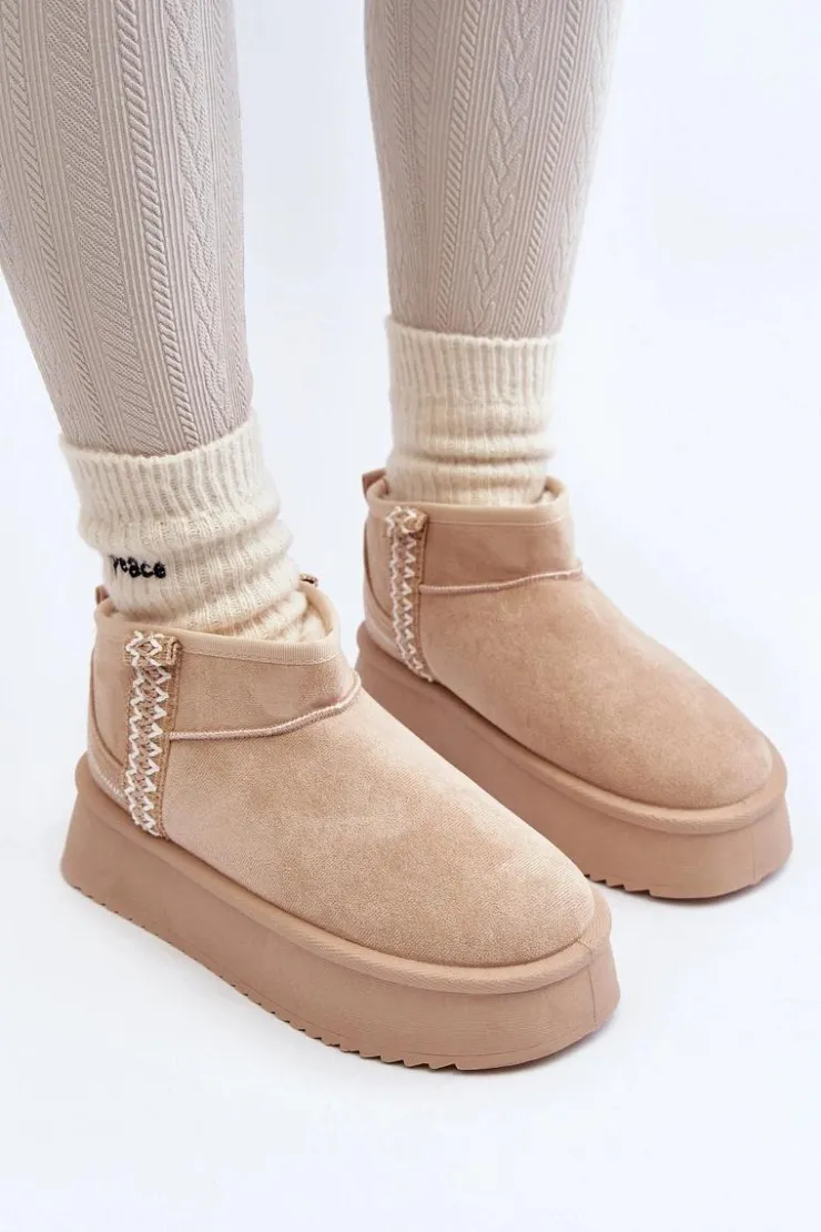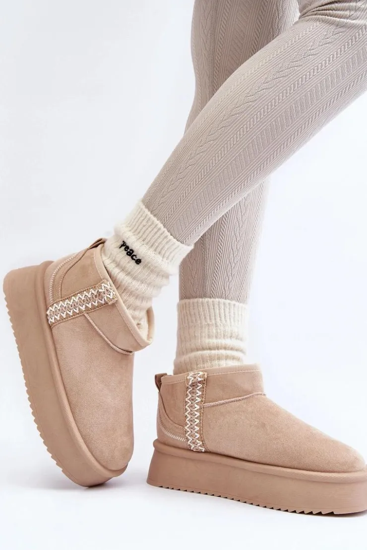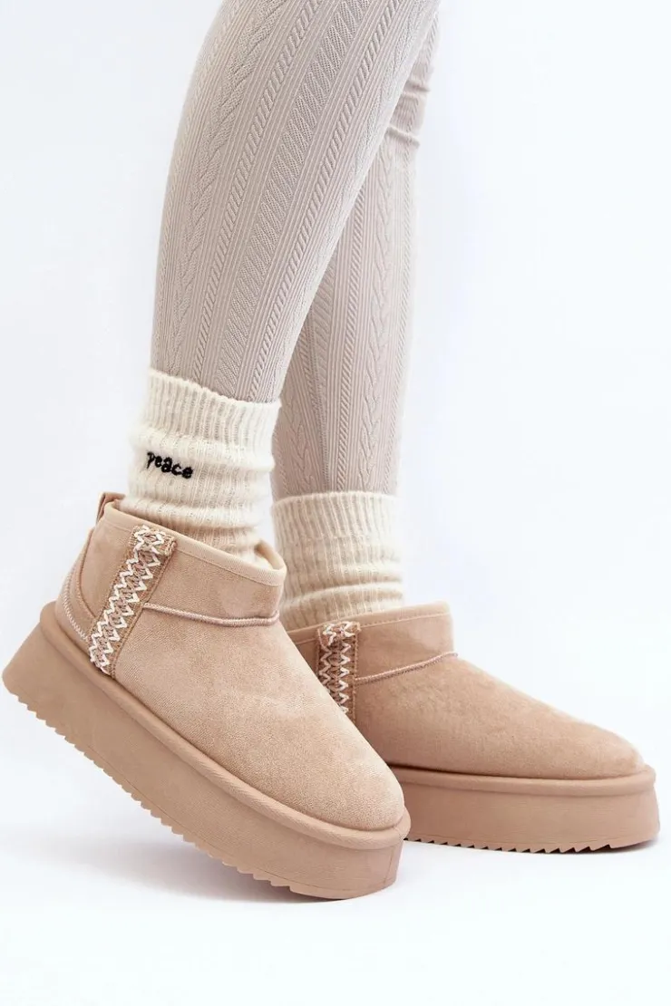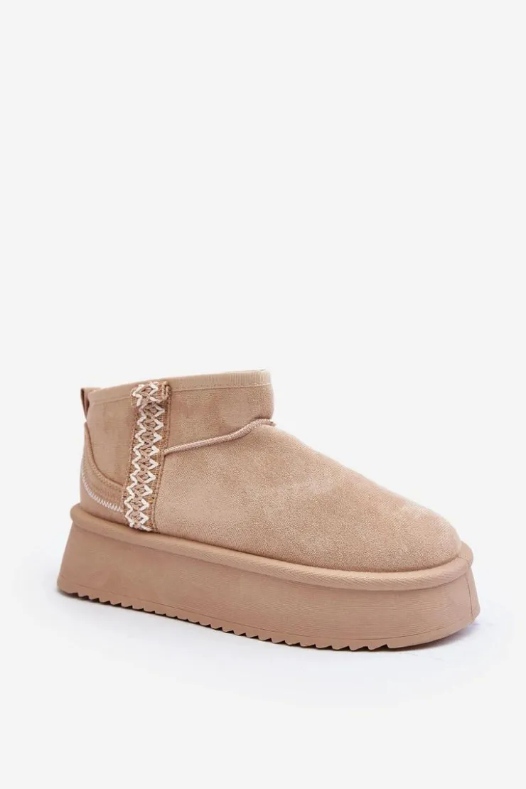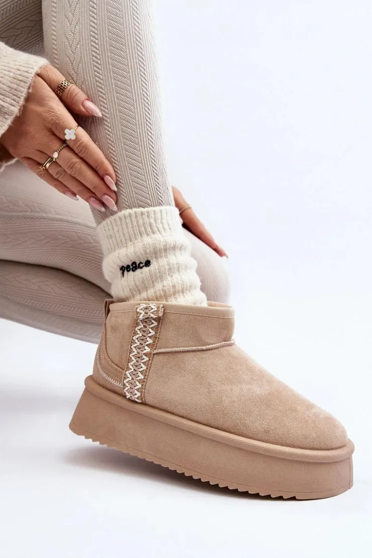 Śniegowce na platformie to najmodniejszy fason tego sezonu! Model ten wykonany został z eko zamszu. Gruba podeszwa z gumowego tworzywa świetnie odizoluje od zimnego podłoża. Cholewka do kostki ozdobiona azteckim wzorem. Środek ocieplony futerkiem. Koniecznie musisz je mieć! Przy wyborze rozmiaru prosimy sugerować się tabelą rozmiarów.