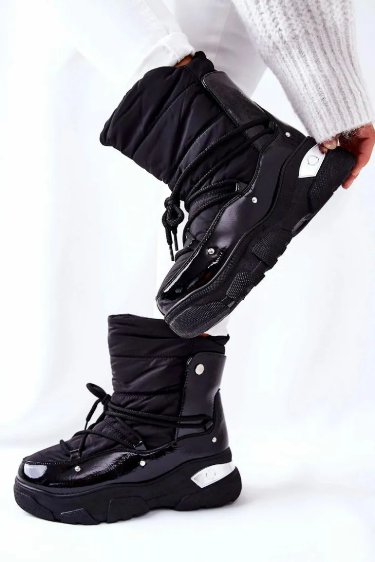 Szukasz ciepłych i wygodnych śniegowców? To dobrze trafiłaś! Śniegowce ocieplane przyjemnym w dotyku futerkiem. Zewnętrzna część buta została wykonana z materiału tekstylnego oraz lakierowanej eko skóry. Solidne sznurowanie zapewni idealne dopasowanie się buta do nogi. Wysoka platforma. Z tyłu podeszwy znajduje się ozdobny element. Przy wyborze rozmiaru prosimy kierować tabelą rozmiarów.