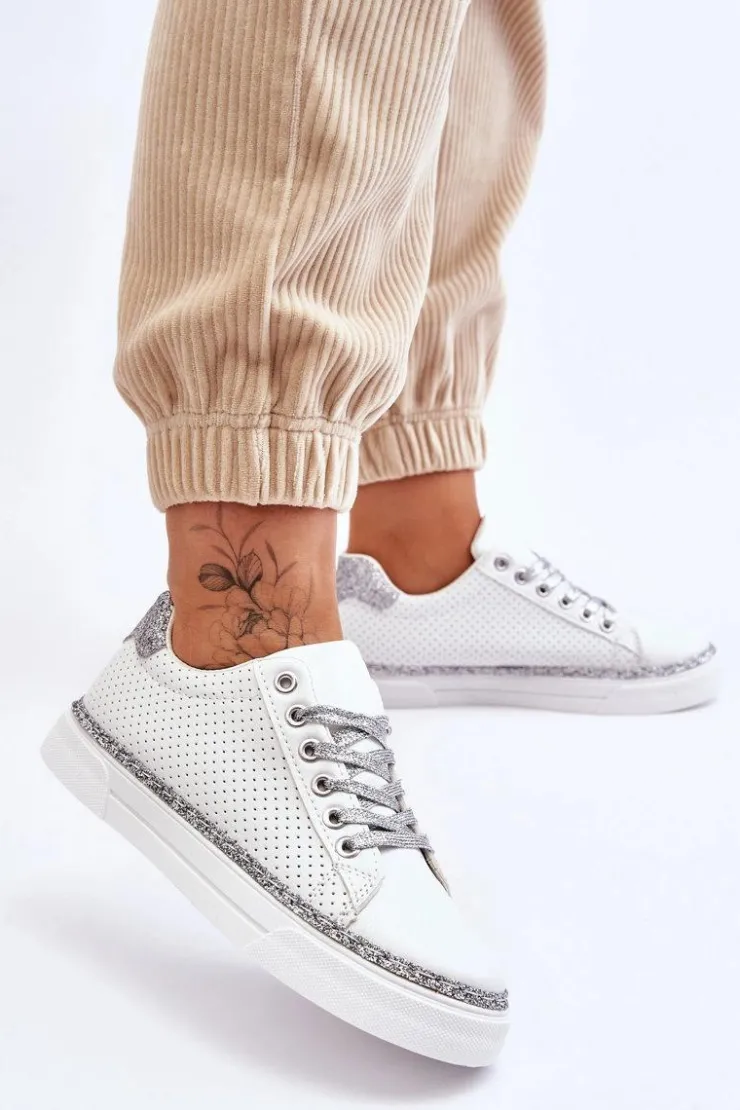 Klasyczne, damskie trampki zostały wzbogacone perforacją po bokach cholewki oraz brokatem. Wokół platformy znajduje się ozdobne przeszycie. Trampki posiadają miękką wkładkę, którą można wyjąć. Model ten posiada klasyczne sznurowanie. Idealne buty do codziennego użytkowania! Powinnaś je mieć! Przy wyborze rozmiaru prosimy sugerować się tabelą rozmiarów.