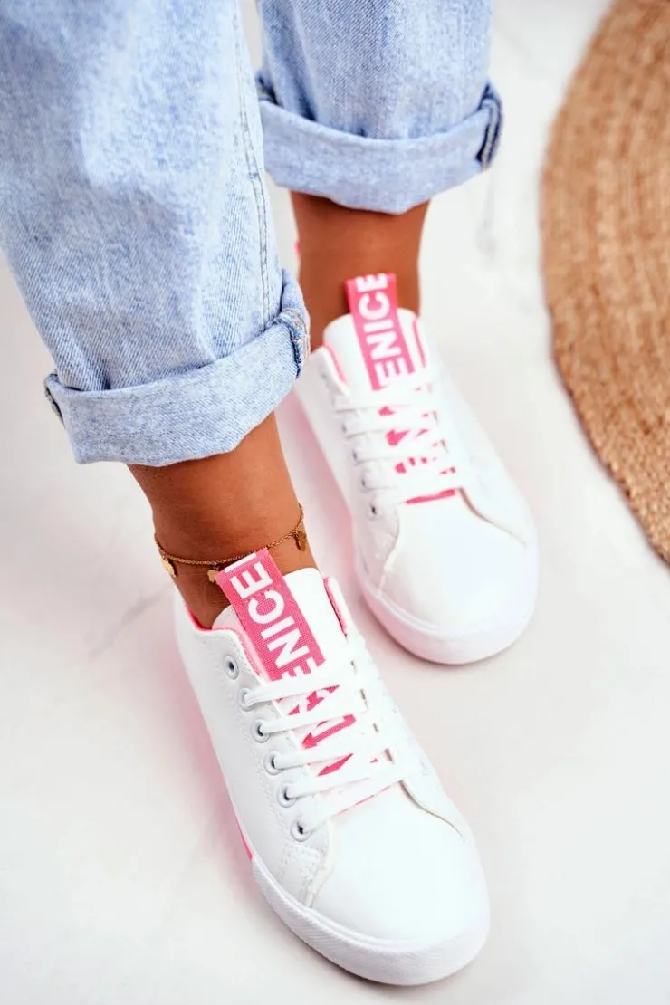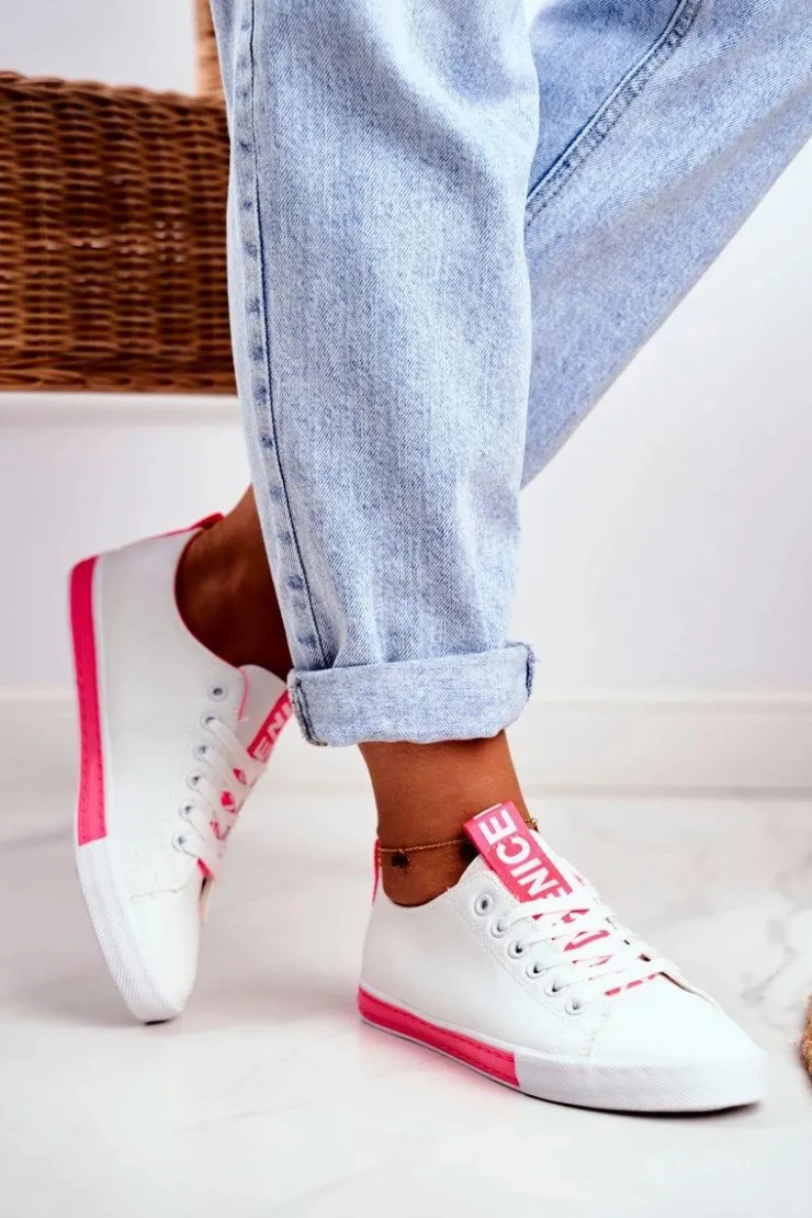 Boto Trampki Damskie Niskie*Trampki Damskie Klasyczne Biało-Neonowo Różowe Ville