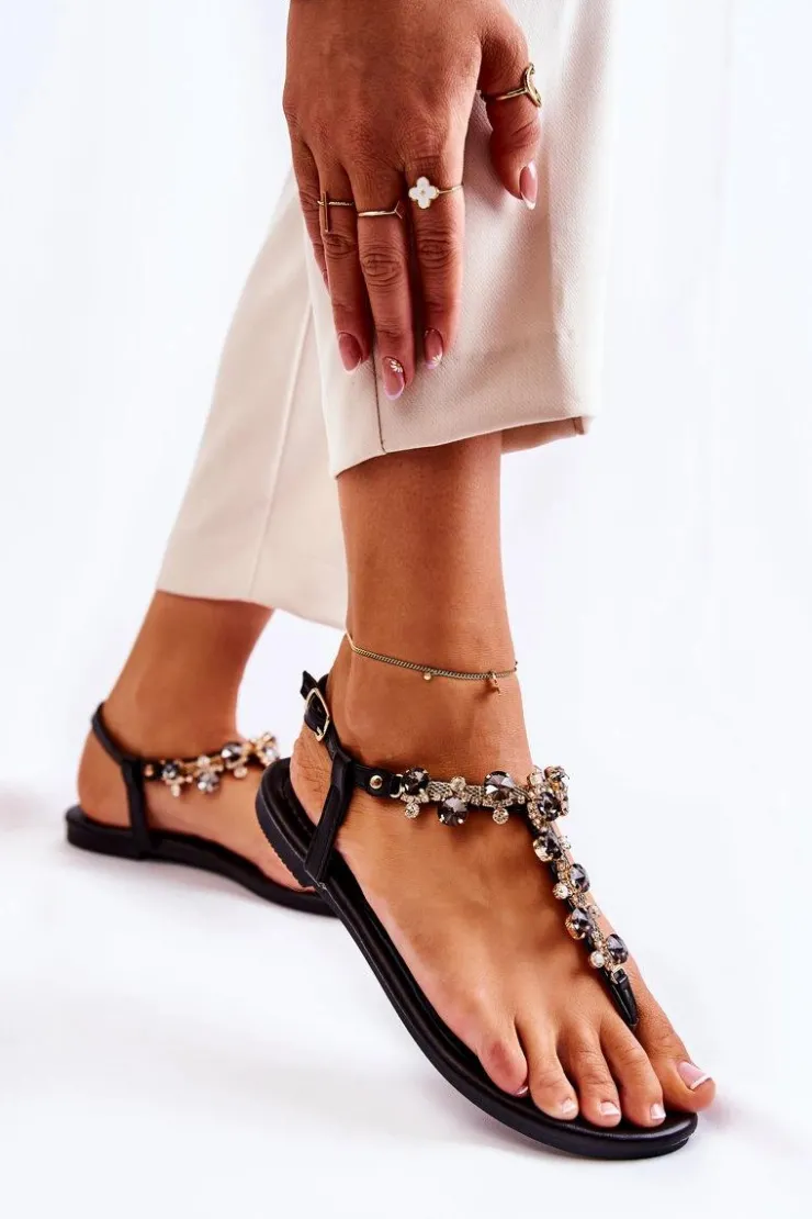 Wygodne sandały w stylu japonek świetnie prezentują się z letnimi stylizacjami. Buty te zostały wykonane z eko skóry. Wkładka jest dodatkowo pikowana. Na paseczkach znajdują się dżety w postaci kryształów oraz cyrkonii. Model zapinany na sprzączkę z regulowanym paskiem, dzięki któremu możesz je odpowiednio dopasować do tęgości nogi. Osadzone na płaskim obcasie z antypoślizgową podeszwą. Przy wyborze rozmiaru prosimy kierować się tabelą rozmiarów.