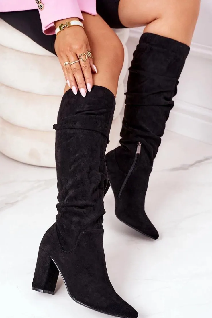 Piękne kozaki na słupku z noskiem w szpic. Cholewka z marszczeniem wykonana jest z miękkiego eko zamszu. Przy wyborze rozmiaru prosimy sugerować się tabelą rozmiarów.