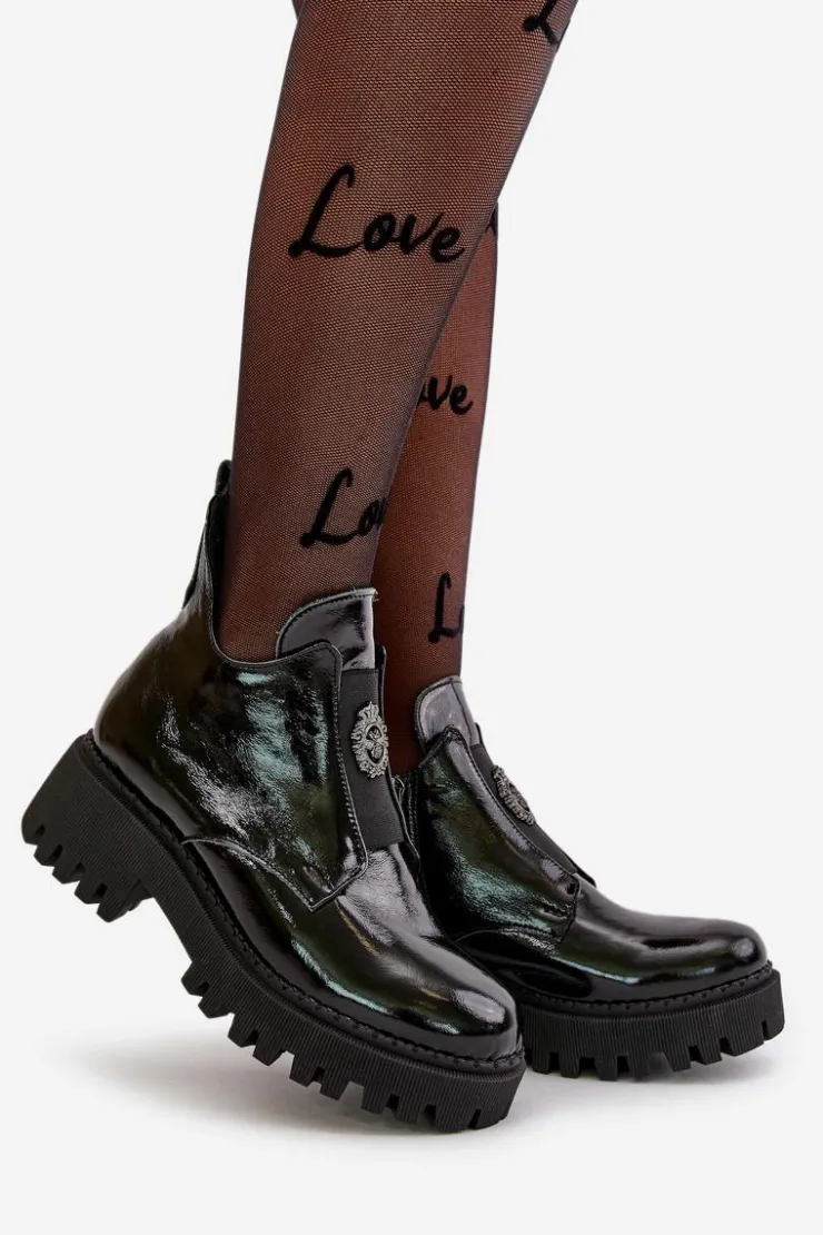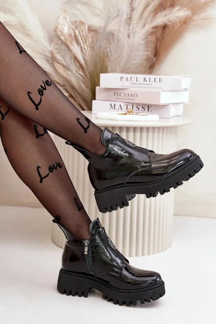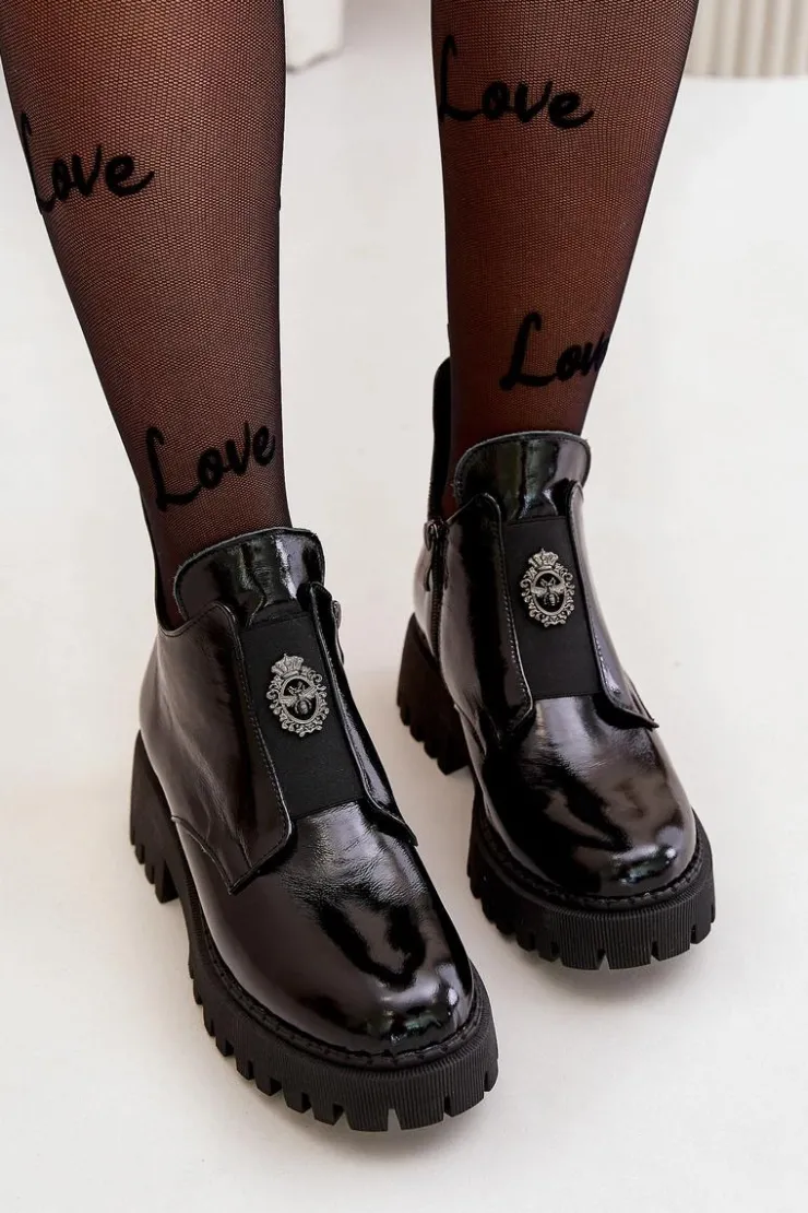 Damskie botki zostały wykonane z wysokiej jakości naturalnej skóry. Osadzone na masywnym obcasie i platformie ze żłobieniami. Model zapinany na suwak po wewnętrznej stronie cholewki. Z przodu na elastycznej wstawce znajduje się ozdoba z tworzywa sztucznego. Wnętrze ocieplone kocem obuwniczym. Ten wyjątkowy model wzbogaci wiele Twoich stylizacji! Przy wyborze rozmiaru prosimy sugerować się tabelą rozmiarów.
