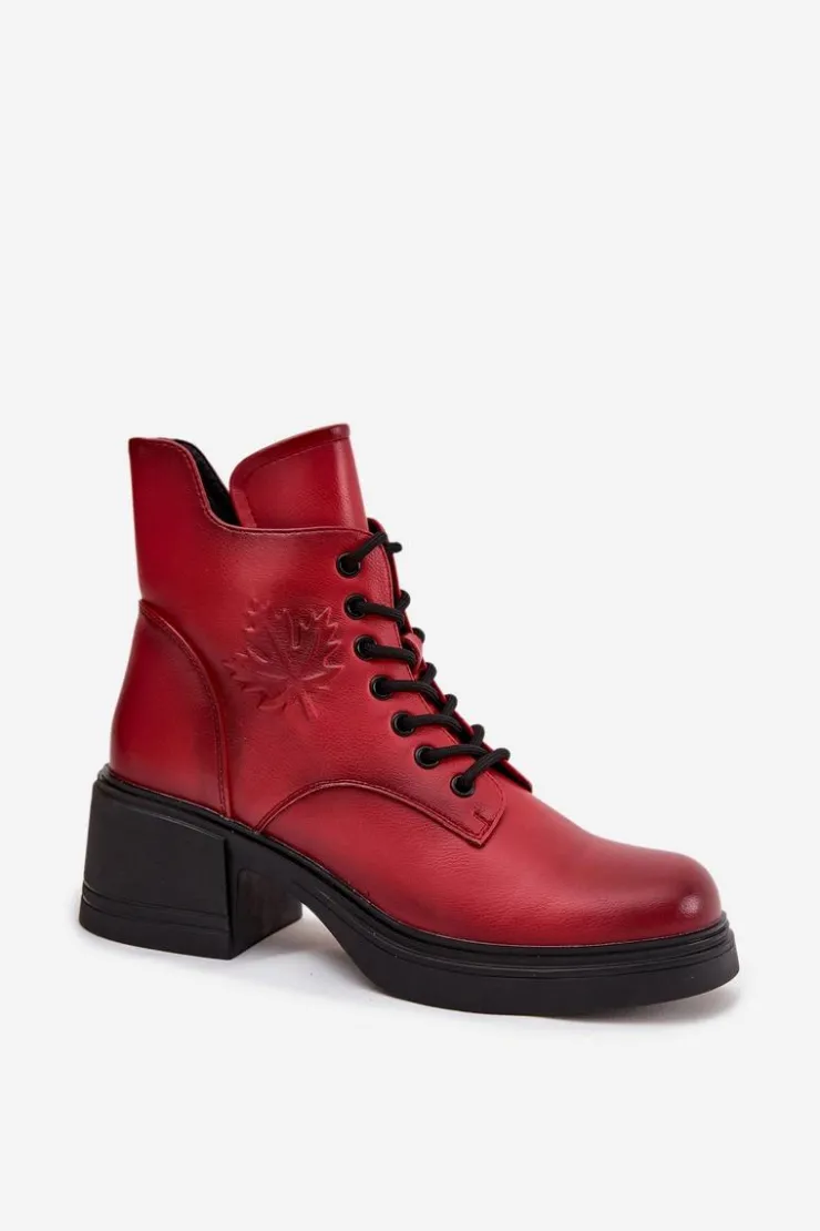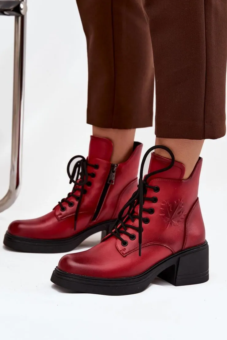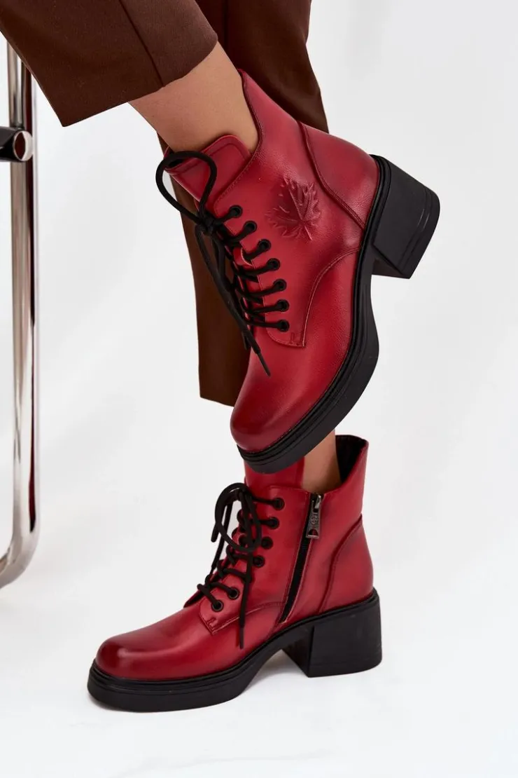 Botki damskie marki Vinceza wykonane z naturalnej skóry to doskonałe obuwie na chłodniejsze dni. Stabilny obcas typu klocek zapewnia wygodę podczas noszenia, a połączenie sznurowania z zamkiem ułatwia zakładanie i dopasowanie do stopy. Wnętrze ocieplane miękkim kocem obuwniczym dba o ciepło i komfort, natomiast subtelne tłoczenie w formie liścia na boku nadaje całości stylowego akcentu. To model, który sprawdzi się zarówno na co dzień, jak i w bardziej szykownych stylizacjach. Przy wyborze rozmiaru prosimy sugerować się tabelą rozmiarów.