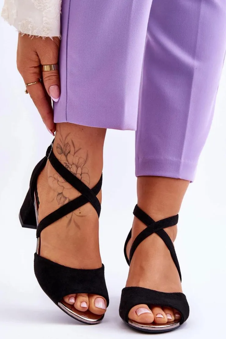 Modne sandałki z krzyżującymi się na środku paskami. Posiadają obcas w postaci niskiego słupka. Sandałki posiadają odkryty, zaokrąglony nosek oraz usztywniany zapiętek. Zapinane wokół kostki na regulowany pasek ze sprzączką. Miękka wkładka pozwoli na komfortowe użytkowanie obuwia. Świetnie sprawdzą się podczas różnego rodzaju imprez, uroczystości czy spotkań.Przy wyborze rozmiaru prosimy sugerować się tabelą rozmiarów.