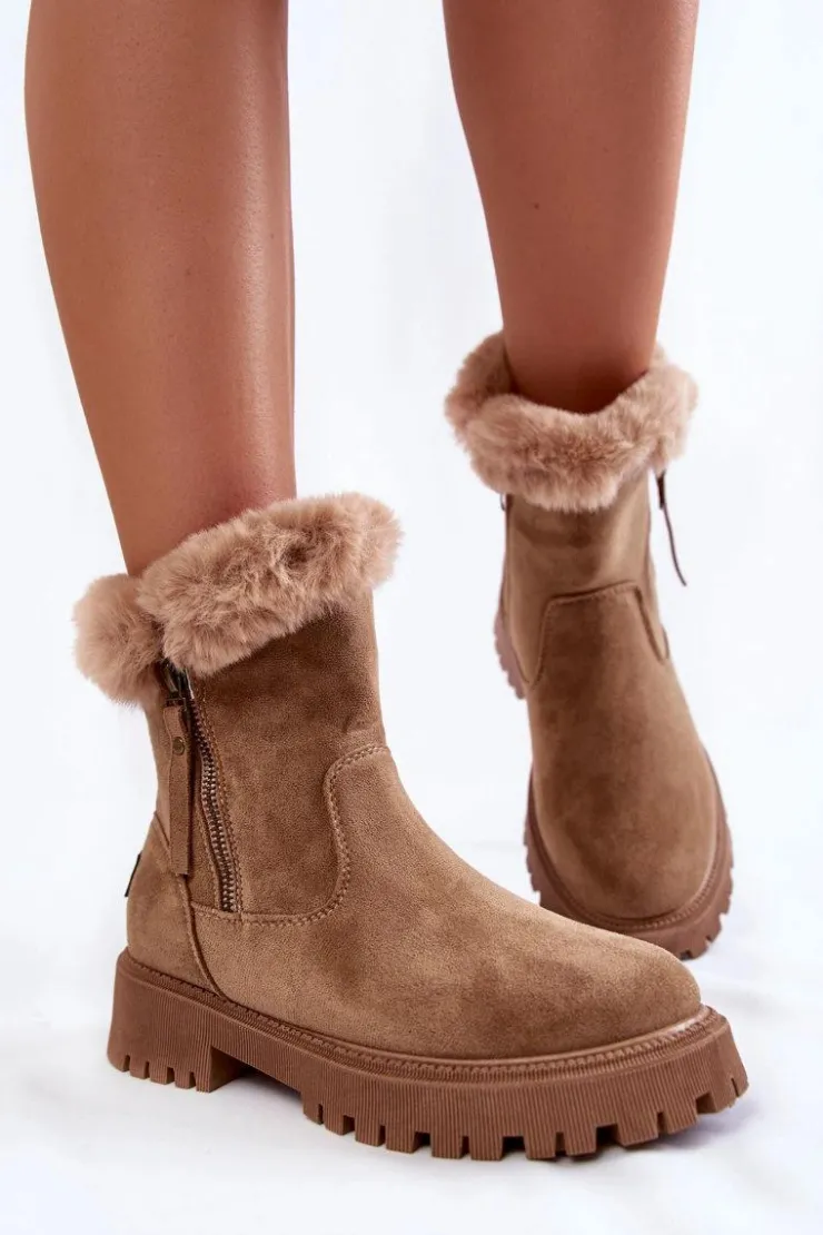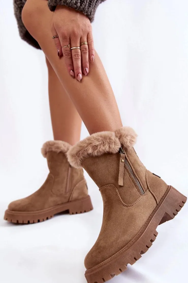 Modne, damskie botki z cholewką zakończoną miękkim futerkiem. Model ten posiada suwak z boku cholewki — jeden ozdobny, drugi ułatwiający zakładanie obuwia. Botki osadzono na płaskim obcasie i platformie ze żłobieniami. Ocieplone wewnątrz miłym w dotyku futerkiem. Zapiętek jest usztywniany. Idealny model na chłodne dni! Przy wyborze rozmiaru prosimy sugerować się tabelą rozmiarów.