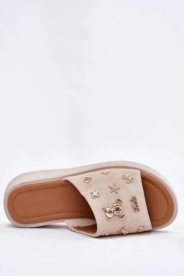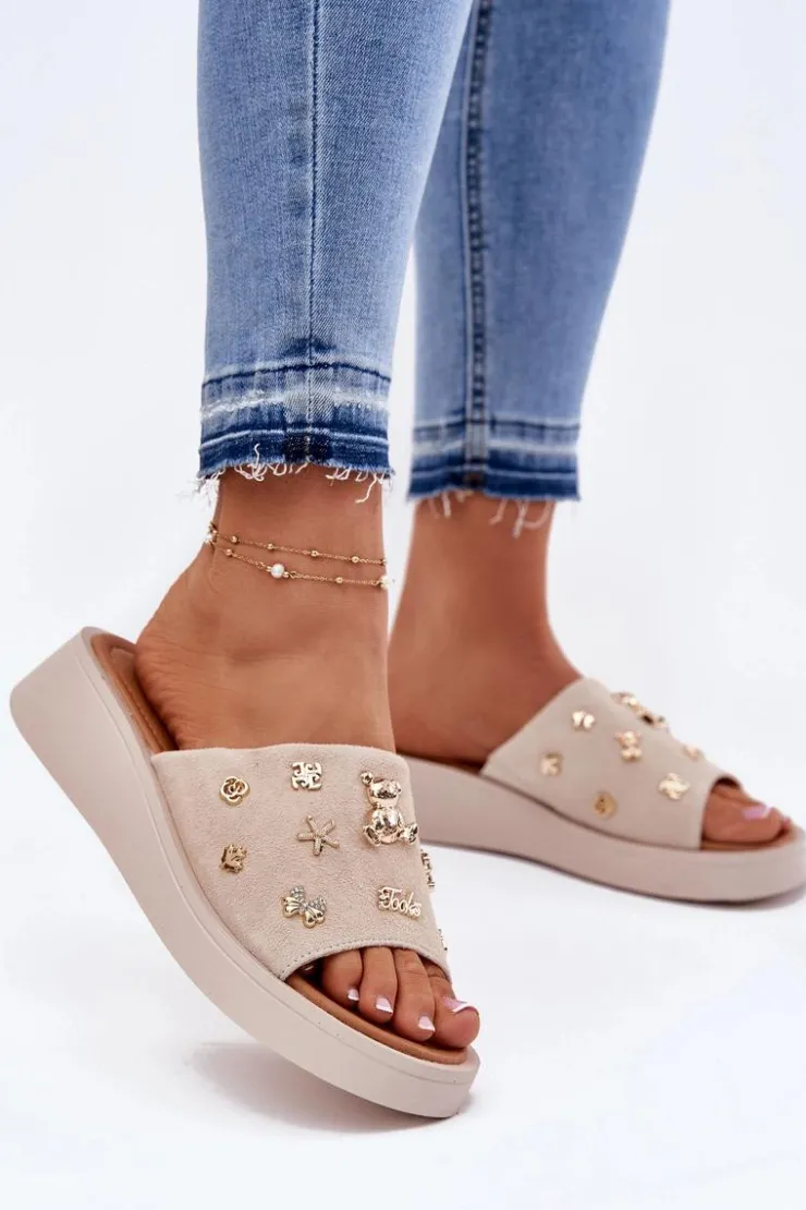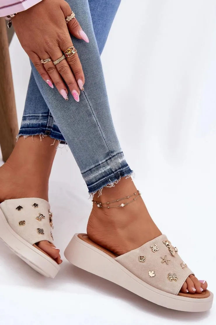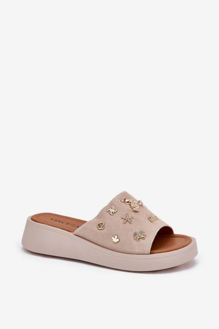 Klapki damskie od marki Vinceza to elegancka i stylowa propozycja na ciepłe dni. Wykonane z naturalnego zamszu, gwarantują wysoką jakość i komfort noszenia. Model osadzony na platformie zapewnia stabilność i wygodę, jednocześnie dodając lekkości całej stylizacji. Klapki wyróżniają się modnymi przypinkami na pasku, które stanowią ciekawy akcent i nadają obuwiu wyjątkowego charakteru. To doskonały wybór dla kobiet szukających połączenia klasyki z nowoczesnym wyglądem. Przy wyborze rozmiaru prosimy sugerować się tabelą rozmiarów.