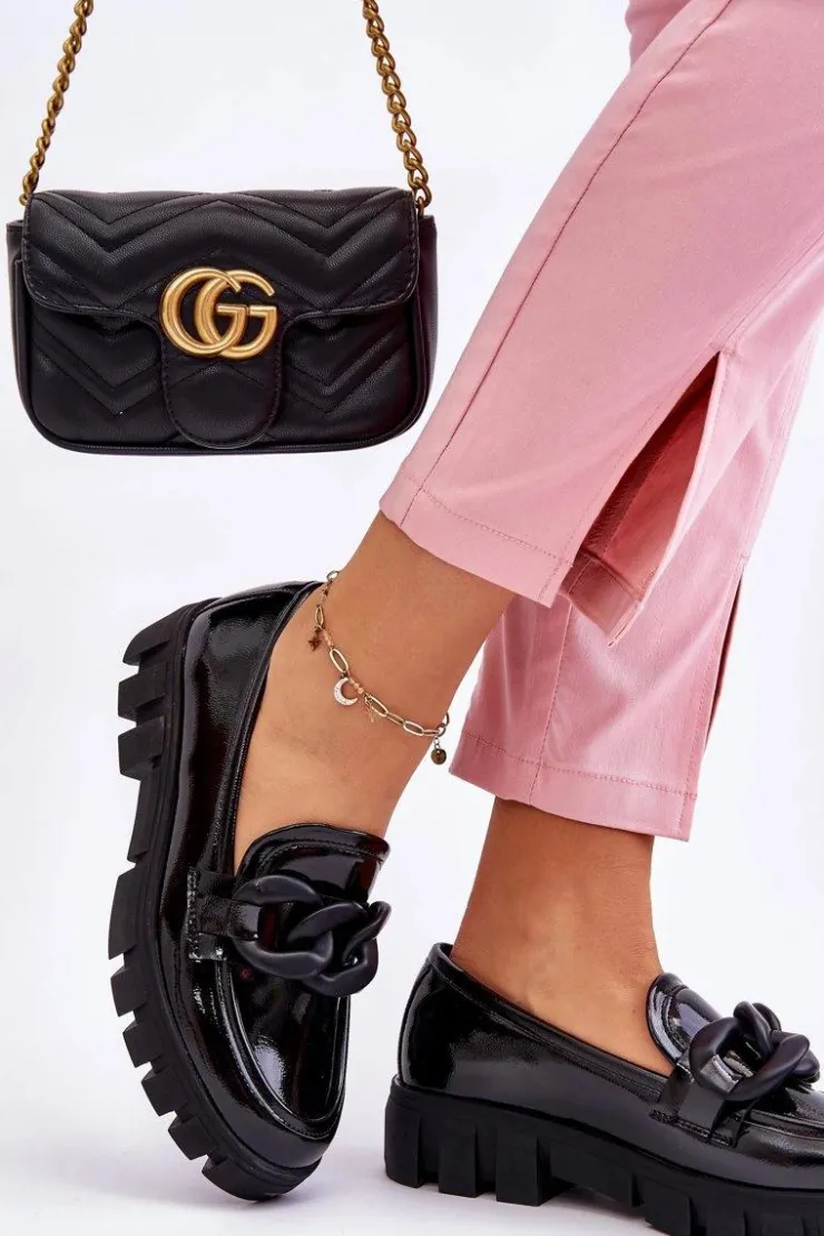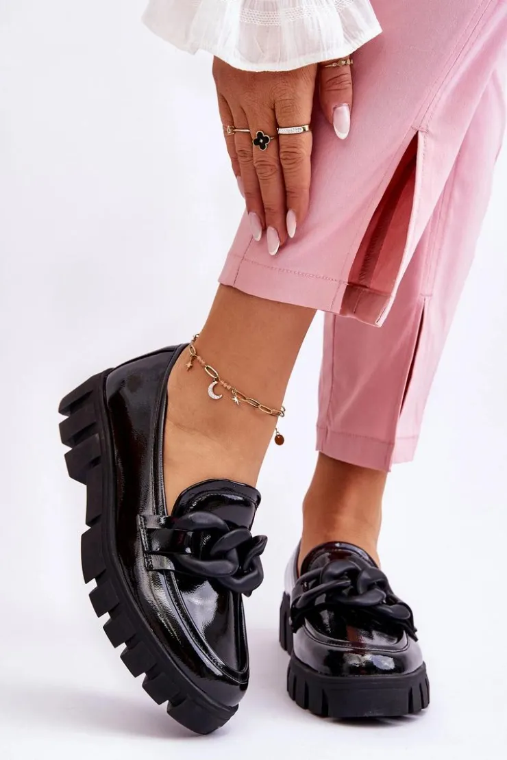 Mokasyny damskie na platformie i płaskim obcasie ze żłobieniami powinny być Twoje! Podeszwa została wykonana z gumowego tworzywa, dzięki któremu jest dodatkowo antypoślizgowa. Miękka wkładka z naturalnej skóry oraz wzmacniany zapiętek zapewni komfortowe użytkowanie. Mokasyny posiadają z przodu ozdobny łańcuch z tworzywa sztucznego. Przy wyborze rozmiaru prosimy sugerować się tabelą rozmiarów.