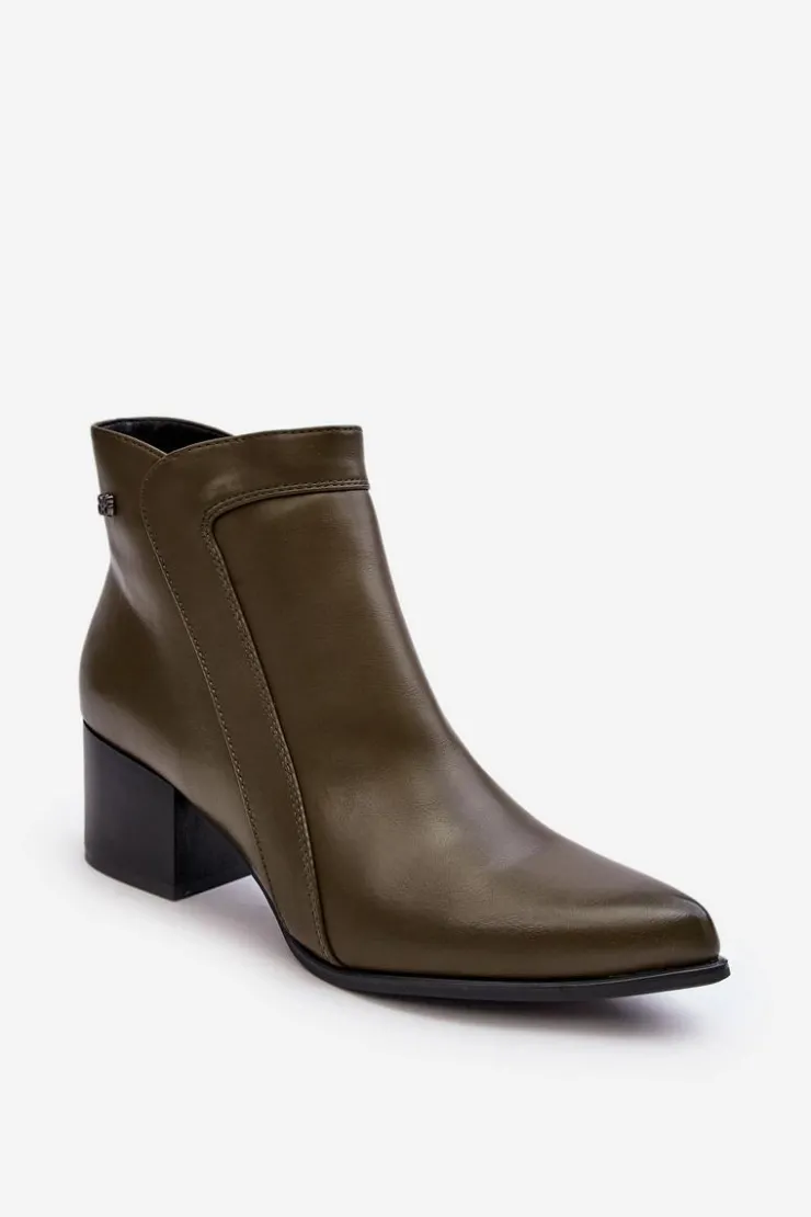 Botki damskie wykonane z eko skóry. Osadzone na niskim obcasie. Środek ocieplony kocem obuwniczym. Model ten zapinany jest na suwak z boku. Cholewka wzbogacona przeszyciami oraz małą ozdobą. Noski w szpic optycznie wysmuklą nogi. Dodatkowo zapiętek w tym obuwiu jest usztywniony. Świetny model, który będzie pasować do wielu jesienno-zimowych stylizacji! Przy wyborze rozmiaru prosimy sugerować się tabelą rozmiarów.