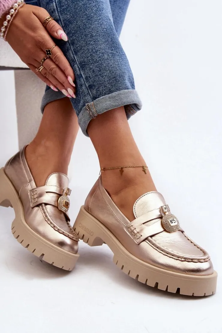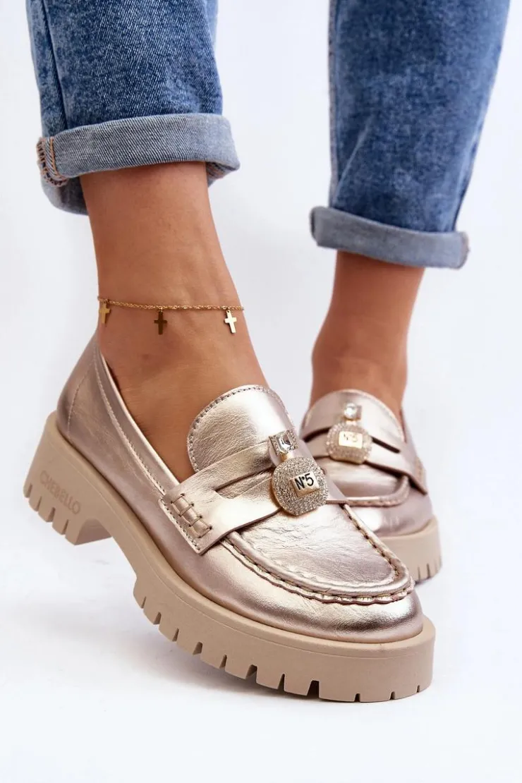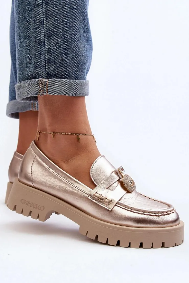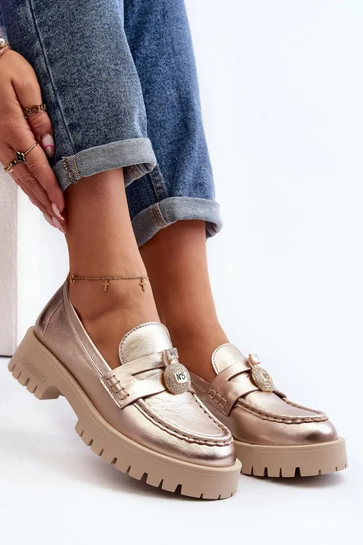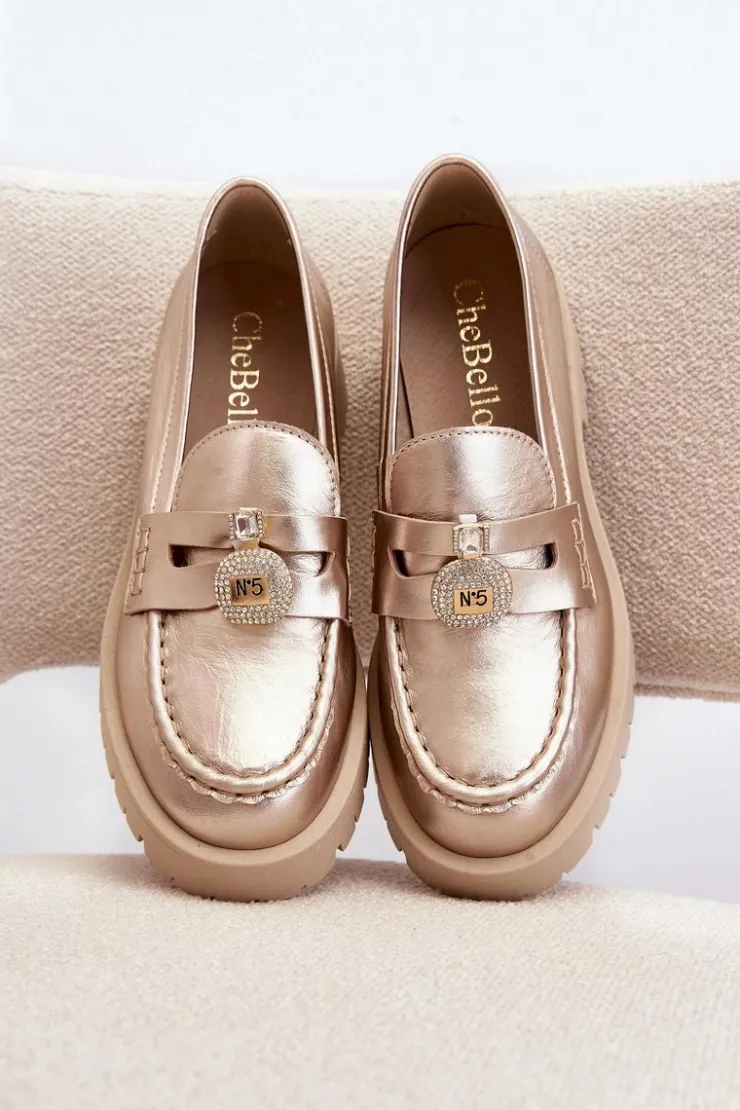 CheBello Mokasyny Płaskie|Mokasyny Damskie Skórzane*Skórzane Półbuty Mokasyny Z Ozdobą 4291 Złote Złoty