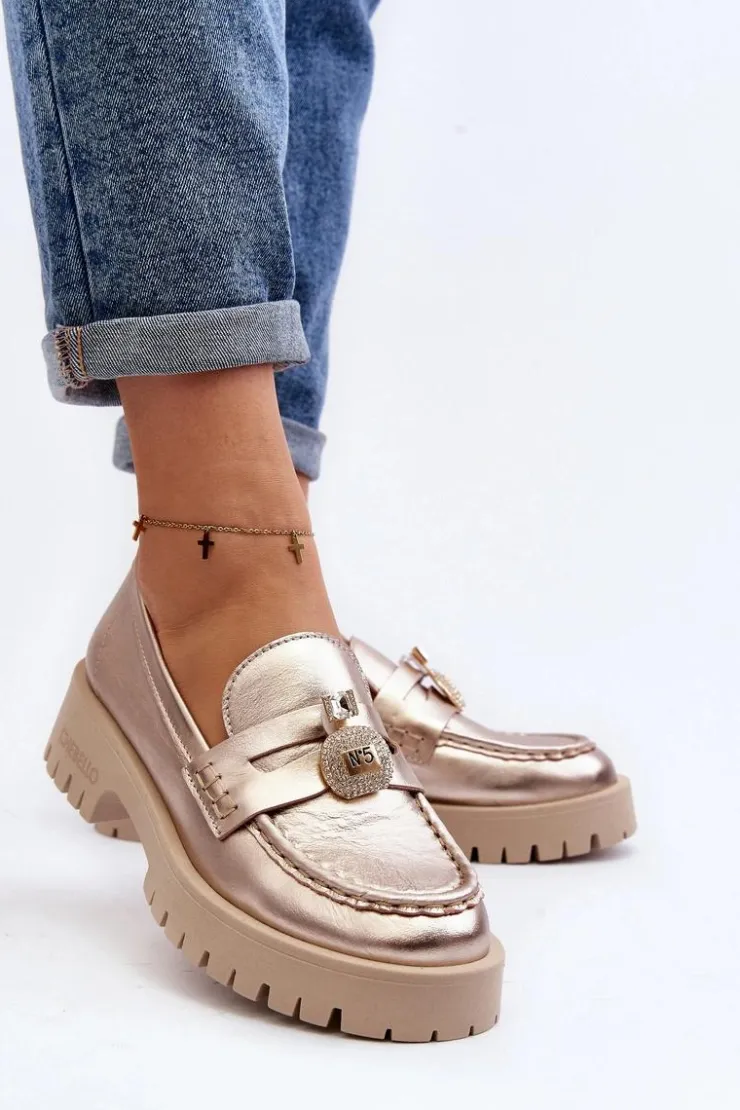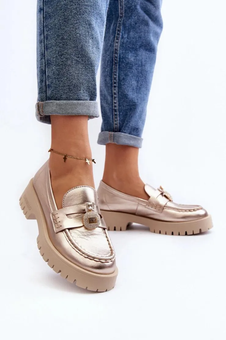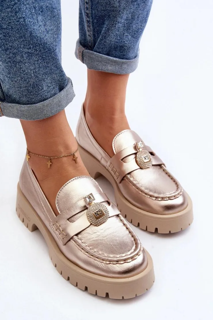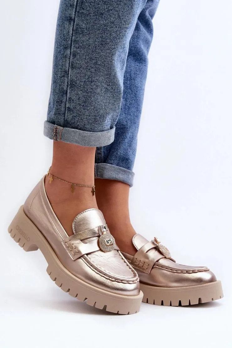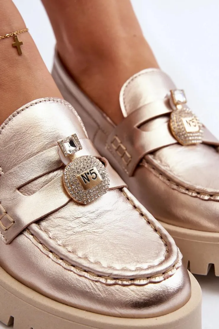CheBello Mokasyny Płaskie|Mokasyny Damskie Skórzane*Skórzane Półbuty Mokasyny Z Ozdobą 4291 Złote Złoty
