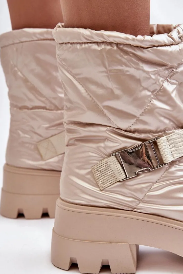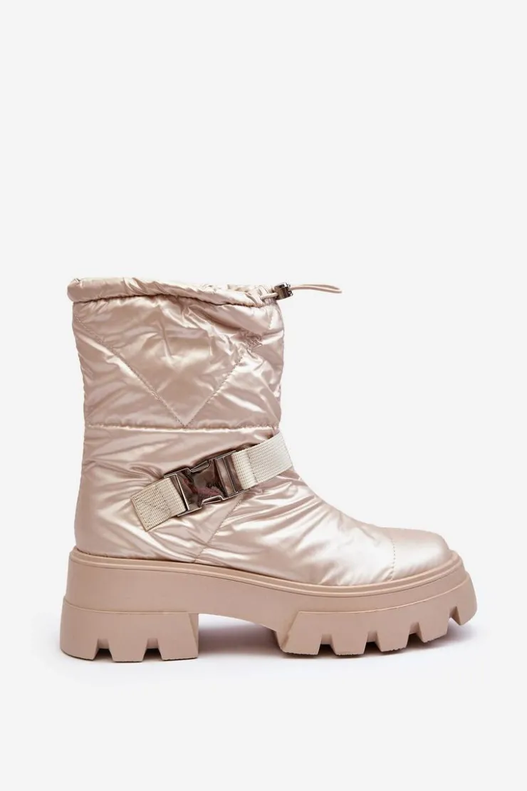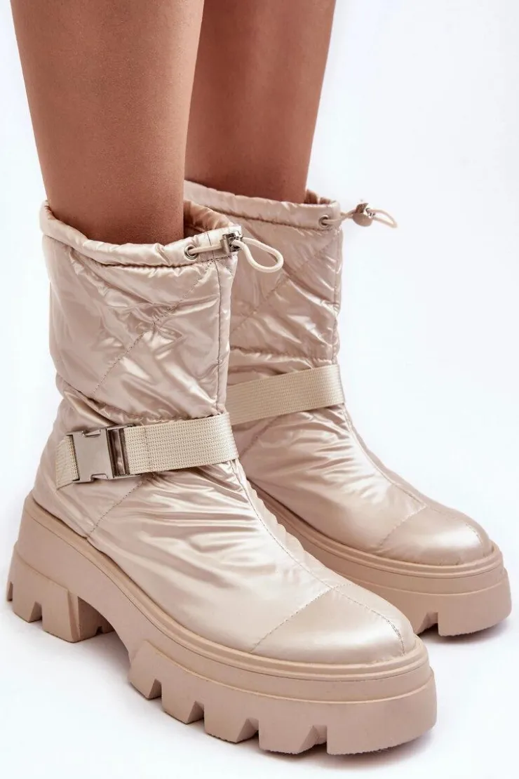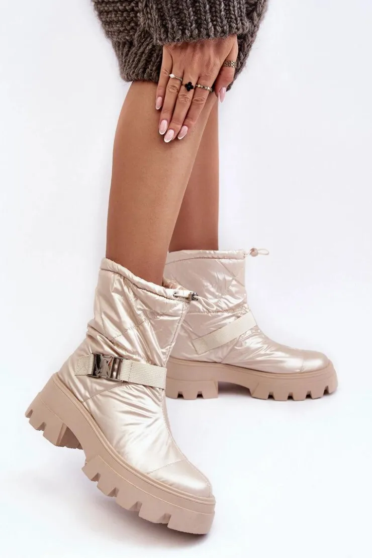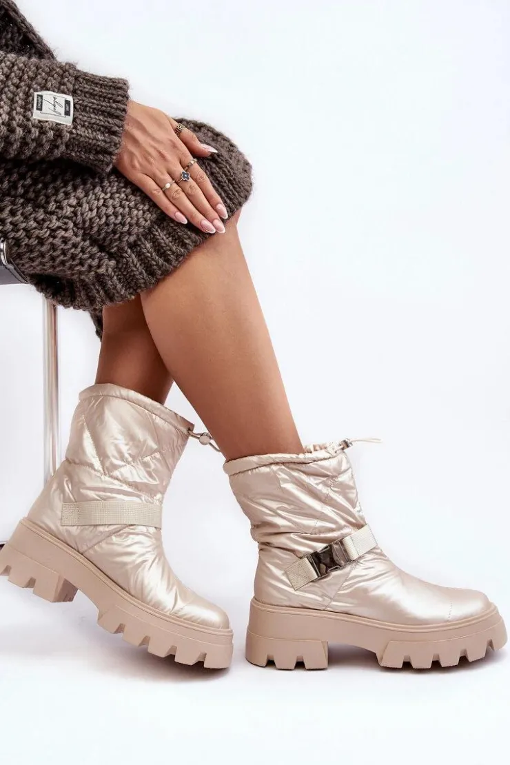 Botki damskie wykonane z materiału tekstylnego. Osadzone na masywnej podeszwie oraz płaskim obcasie. Model wsuwany ze ściągaczem na górze cholewki. Zapiętek jest usztywniony. Noski zaokrąglone. Środek nie jest ocieplony. Przy wyborze rozmiaru prosimy sugerować się tabelą rozmiarów.