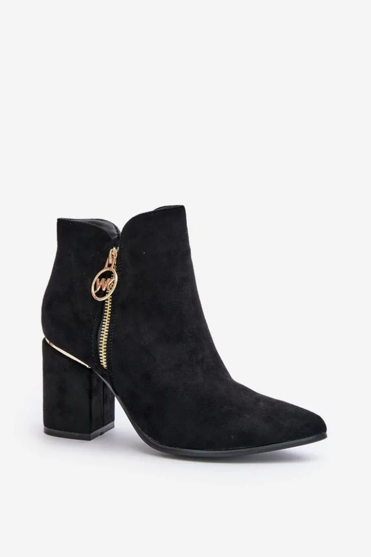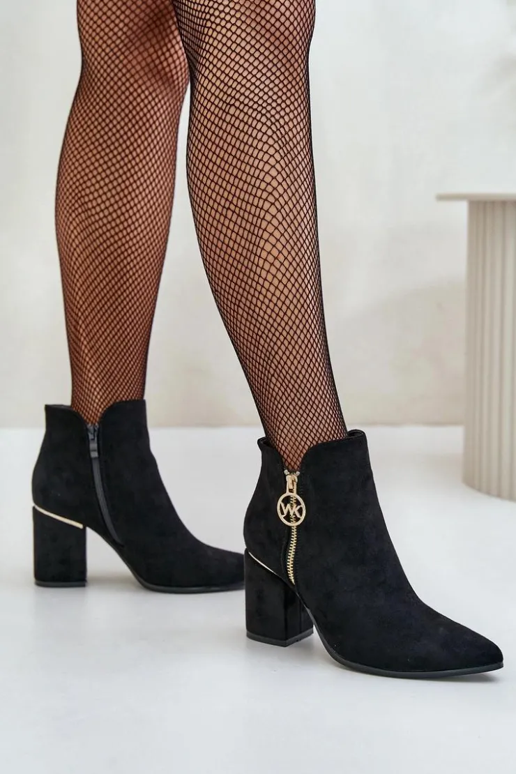 Eleganckie botki z eko zamszu, osadzone na obcasie typu słupek. Wyróżniają się spiczastymi noskami, które nadają im szyku. Wnętrze jest ocieplone, zapewniając komfort w chłodniejsze dni. Zapinane na zamek z boku, dodatkowo ozdobione złotym zamkiem, co dodaje wyjątkowego stylu. Przy wyborze rozmiaru prosimy sugerować się tabelą rozmiarów.