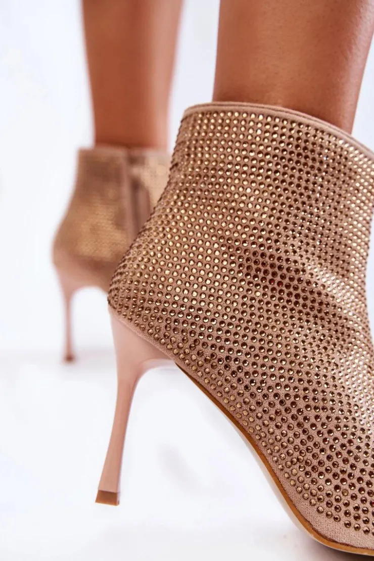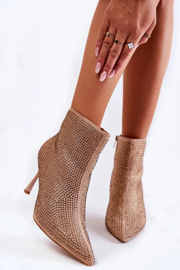 Cudowne botki zostały wykonane z eko zamszu. Model osadzony na obcasie w postaci szpilki, z noskiem w szpic świetnie wysmukli nogi. Cholewka została ozdobiona mieniącymi się dżetami. Botki są zapinane z boku na suwak. Zapiętek w tych botkach jest usztywniany. Model ten świetnie sprawdzi się w wielu stylizacjach! Te botki koniecznie musisz mieć w swojej szafie! Przy wyborze rozmiaru prosimy sugerować się tabelą rozmiarów.