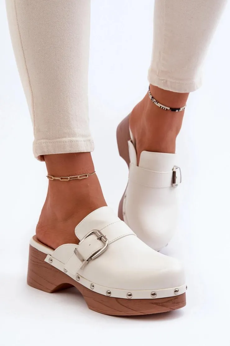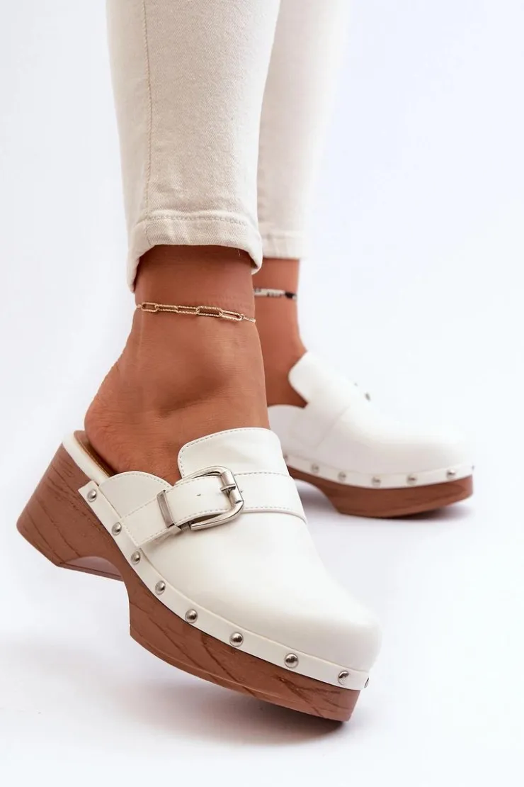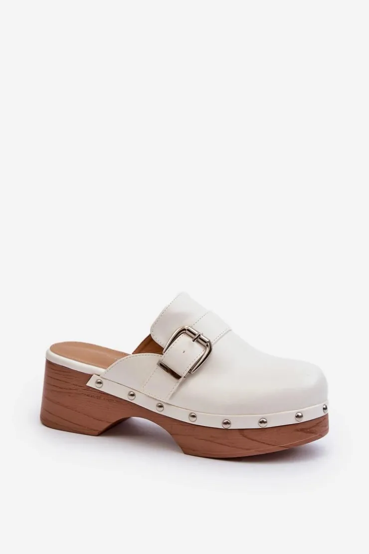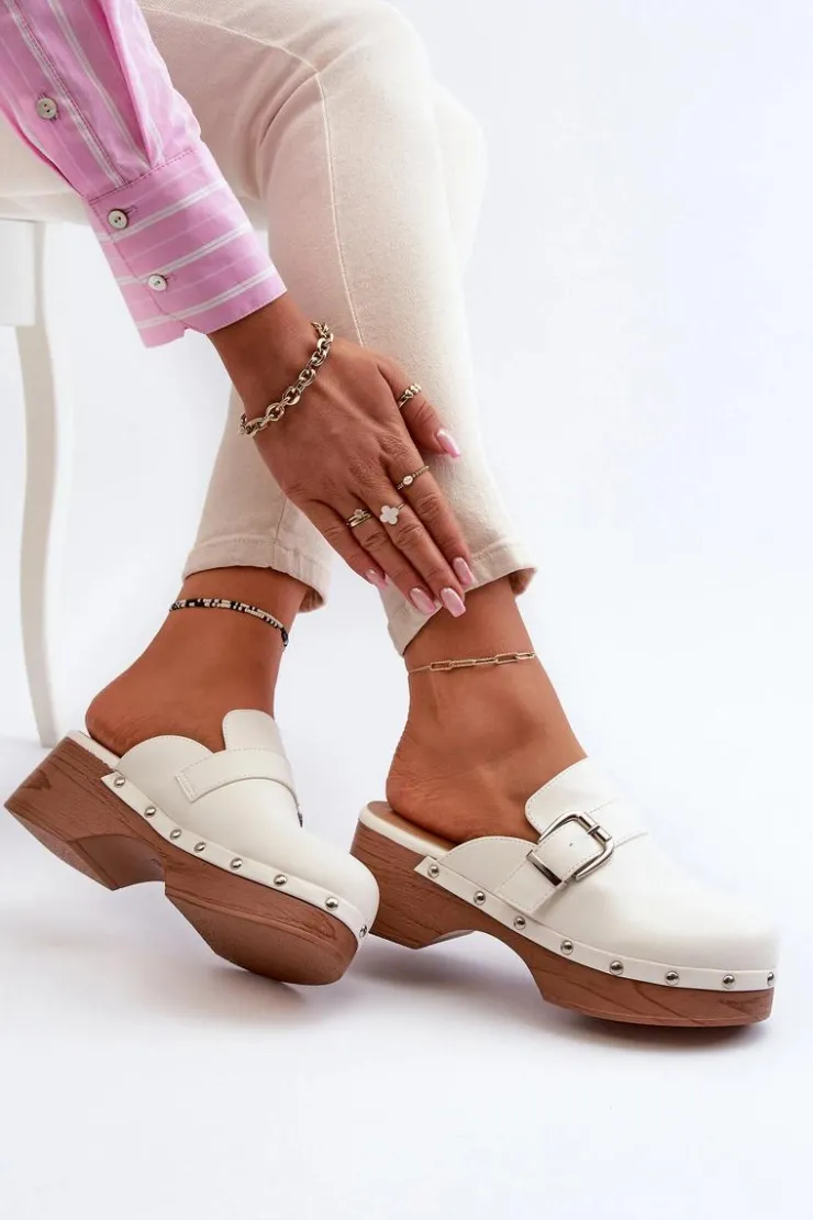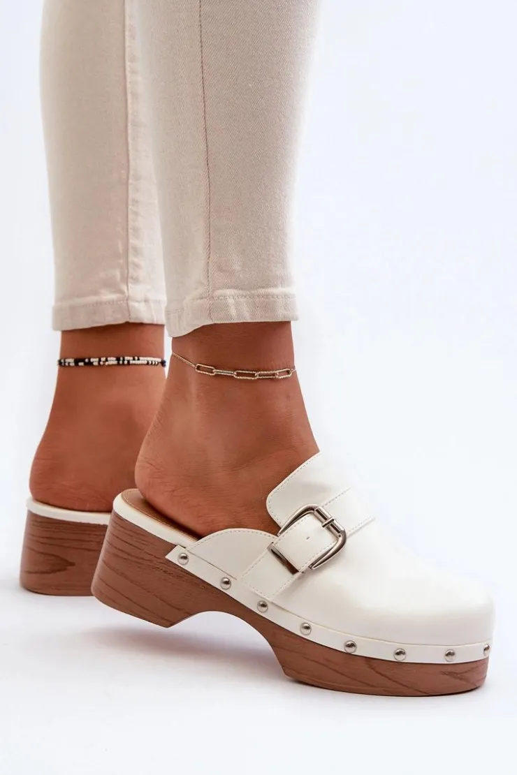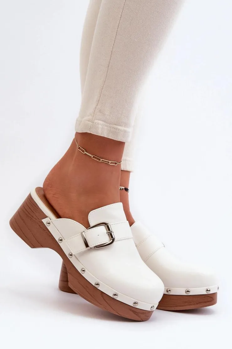 Lekkie klapki osadzone na obcasie i platformie, co nadaje im subtelny wyraz. Na cholewce pasek z klamrą oraz ozdobne ćwieki wokół podeszwy. Wykonane z eko skóry, zarówno cholewka, jak i wkładka gwarantują trwałość i komfort noszenia. Ten model świetnie komponuje się z codziennymi stylizacjami, dodając im nuty szyku i wyrafinowania. Przy wyborze rozmiaru prosimy sugerować się tabelą rozmiarów.