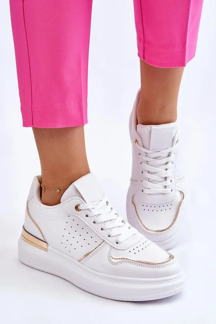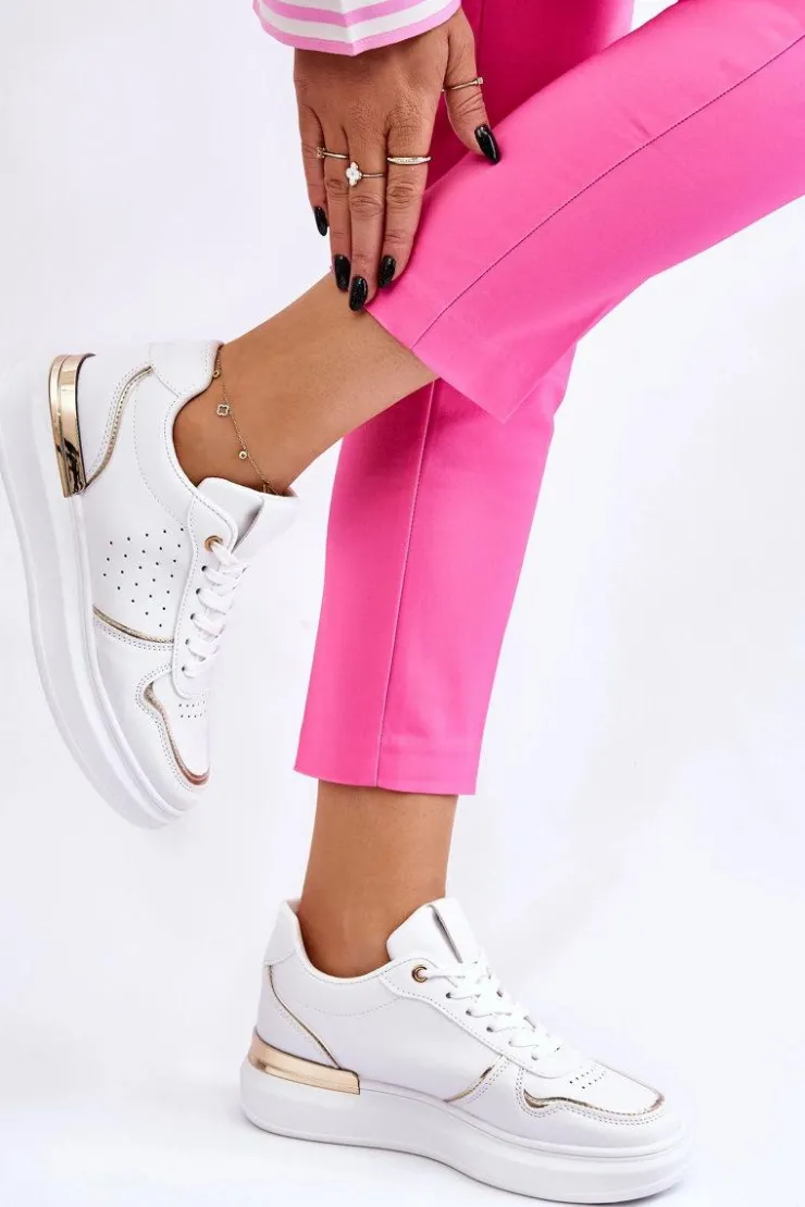Wygodne, sportowe damskie buty zostały wykonane z eko skóry z delikatną perforacją na boku oraz przodzie cholewki. Wiązane na płaskie sznurowadła. Osadzone na masywnej platformie z tworzywa sztucznego. Wkładka wykonana z tkaniny jest komfortowa podczas użytkowania. Nosek jest zaokrąglony. Model ten pasuje do wielu sportowych stylizacji.Przy wyborze rozmiaru prosimy kierować tabelą rozmiarów.