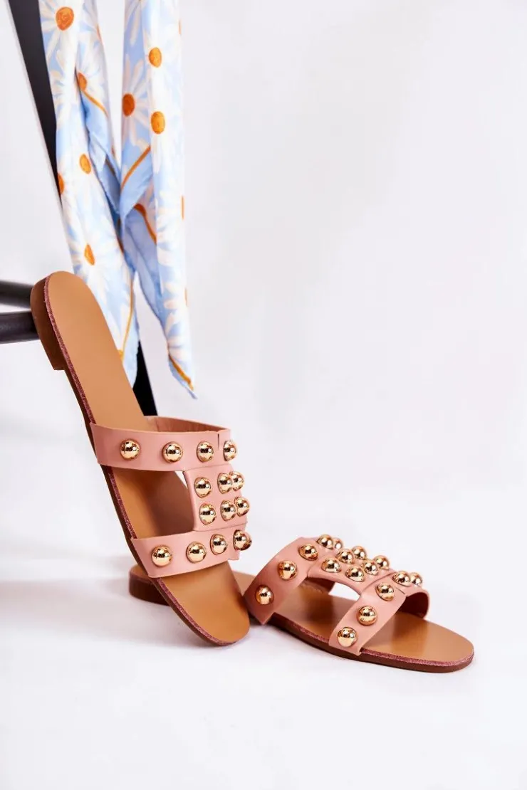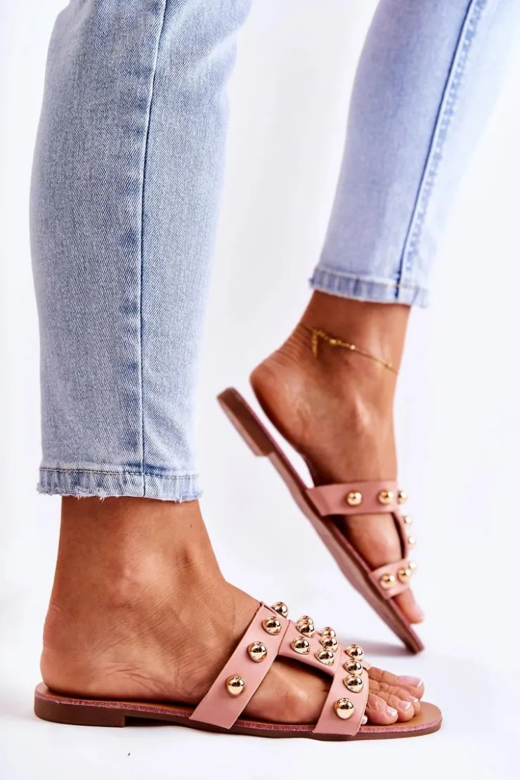 Klasyczne klapki damskie wykonane z eko skóry posiadają delikatne nacięcia na paskach. Zostały ozdobione lustrzanymi elementami w postaci półkul. Miękka wkładka wykonana z eko skóry. Buty zostały osadzone na płaskim obcasie. Podeszwa wykonana z gumowego tworzywa, która jest dodatkowo antypoślizgowa. Świetny model, który sprawdzi się podczas upalnych dni! Przy wyborze rozmiaru prosimy sugerować się tabelą rozmiarów.