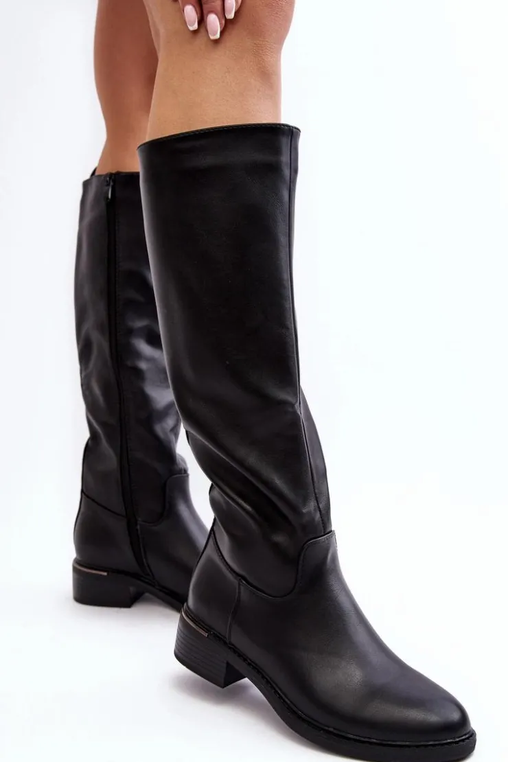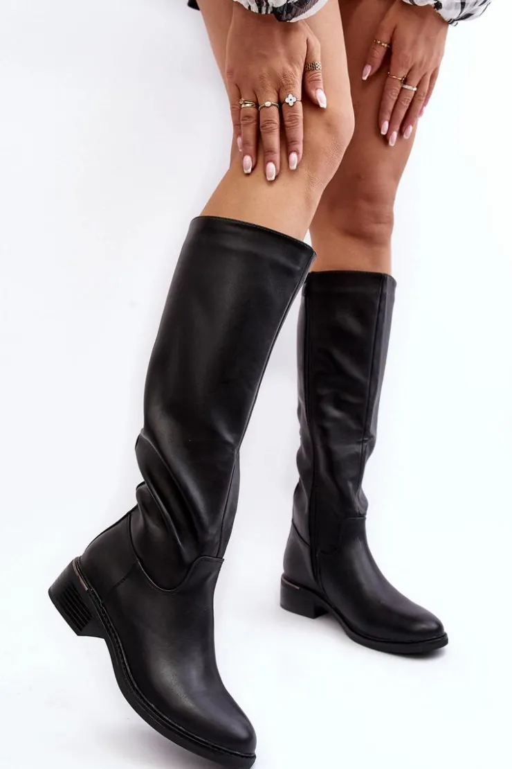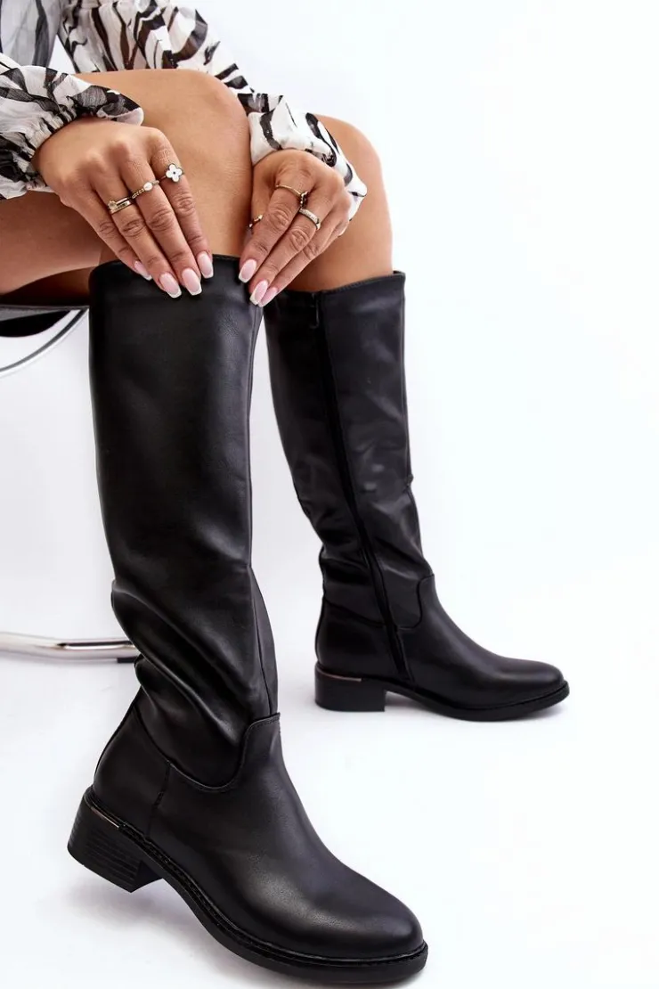 Damskie, klasyczne kozaki zostały wykonane z eko skóry. Osadzone na płaskim, stabilnym obcasie. Cholewka przed kolano zapinana suwakiem. Noski zaokrąglone. Zapiętek usztywniony. Miękka wkładka zapewni komfortowe użytkowanie obuwia. Idealne do każdej jesienno-zimowej stylizacji! Przy wyborze rozmiaru prosimy kierować tabelą rozmiarów.