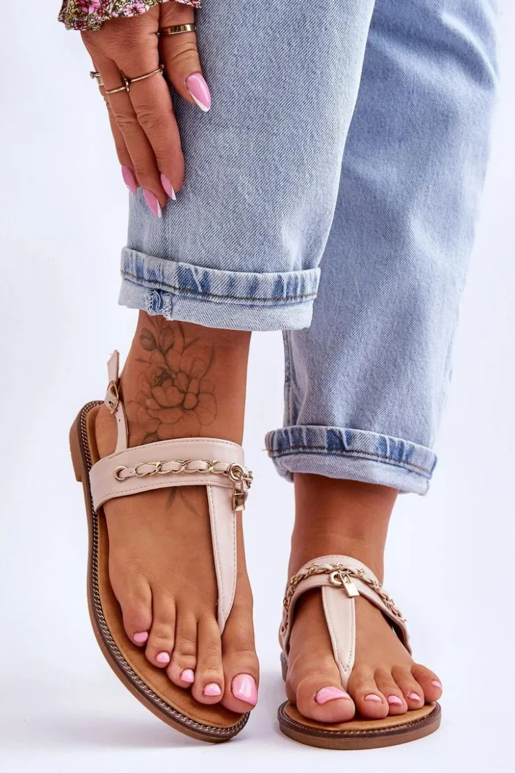 Sandały o fasonie japonek to idealny wybór na cieplejsze dni! Zostały wykonane z eko skóry. Posiadają zdobienie w postaci łańcuszka oraz kłódki. Zapinane wokół kostki na regulowany pasek ze sprzączką. Dodatkowo na podeszwie przy wkładce znajdują się zdobienia. Sandałki osadzono na płaskim obcasie i gumowej podeszwie. Komfortowa w użytkowaniu wkładka została wykonana z eko skóry. Przy wyborze rozmiaru prosimy kierować się tabelą rozmiarów.