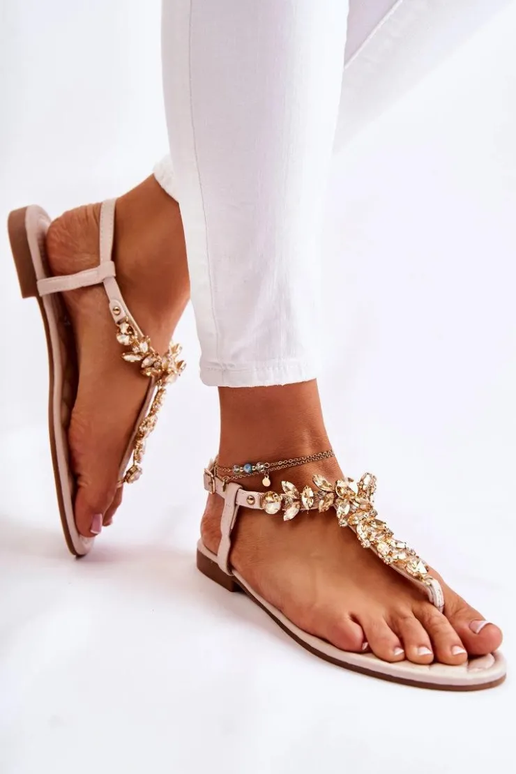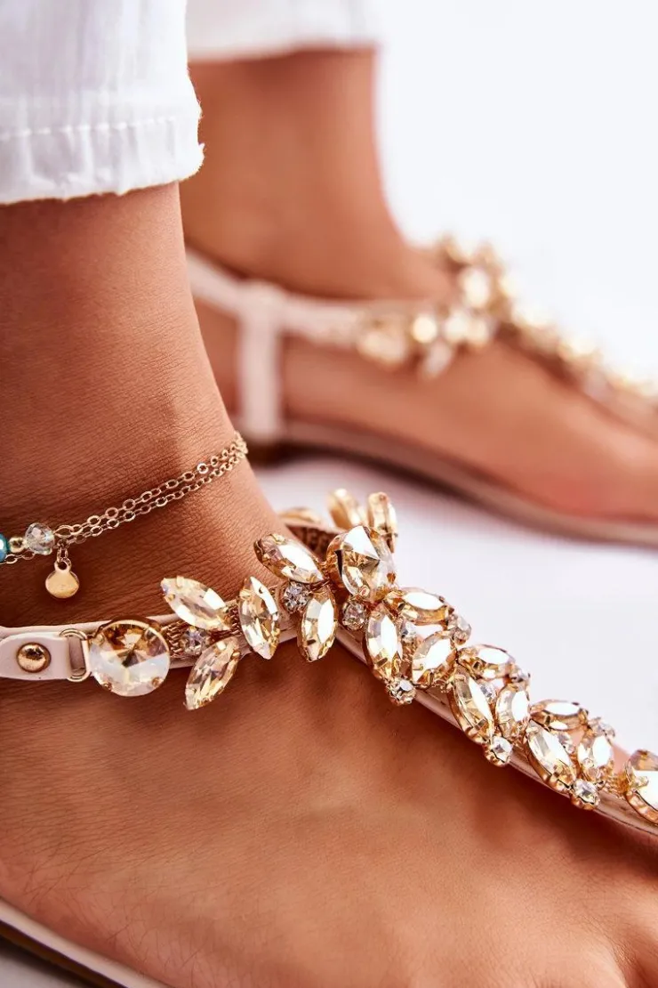 Modne sandały w postaci japonek zostały wykonane z eko skóry. Cienkie paski przyozdobione dżetami w postaci mieniących się kryształów oraz cyrkonii. Model zapinany na sprzączkę z regulowanym paskiem, dzięki któremu możesz je odpowiednio dopasować do tęgości nogi. Miękka wkładka jest dodatkowo pikowana. Sandały świetnie będą prezentować się z wieloma stylizacjami! Przy wyborze rozmiaru prosimy kierować się tabelą rozmiarów.