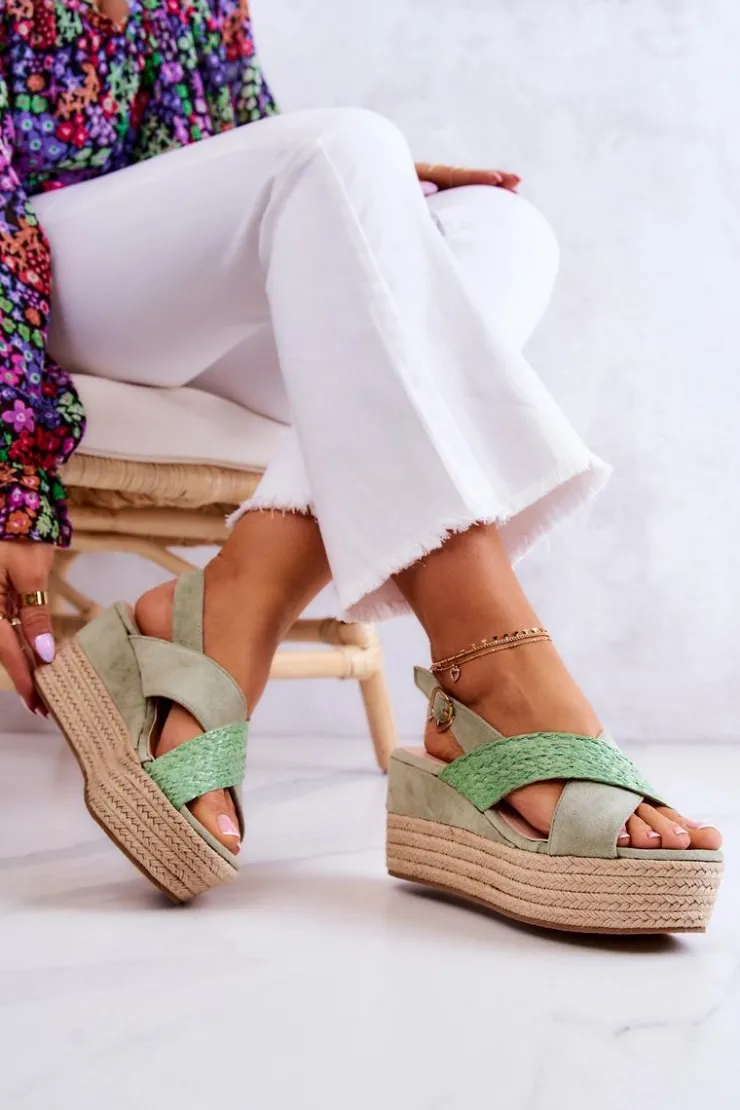 Sandały na wysokiej platformie zdobione lnianą plecionką oraz eko zamszową skórą. Zapinane na regulowany pasek ze sprzączką. Dwa skrzyżowane paski stabilizujące stopę wykonane z zamszowej eko skóry oraz tworzywa sztucznego. Buty świetnie komponują się z długimi sukienkami. Miękka, eko skórzana wkładka pozwoli na użytkowanie sandałów przez cały dzień. Idealne do pracy, spotkanie ze znajomymi czy weekendowy wyjazd. Przy wyborze rozmiaru prosimy sugerować się tabelą rozmiarów.