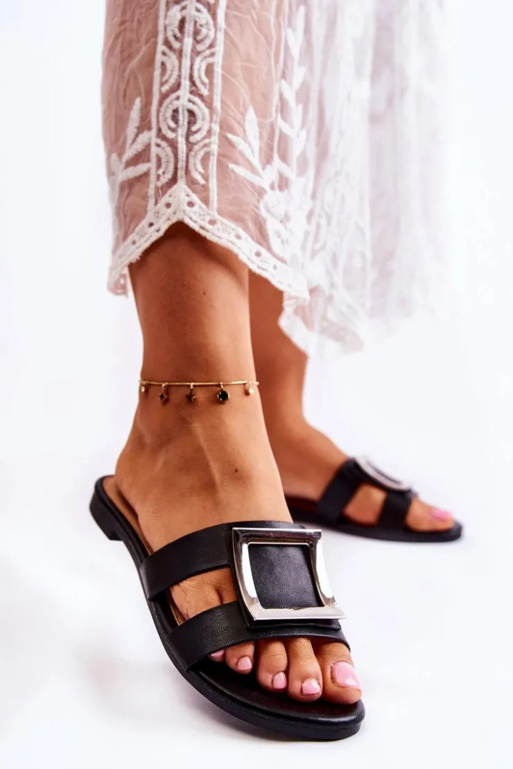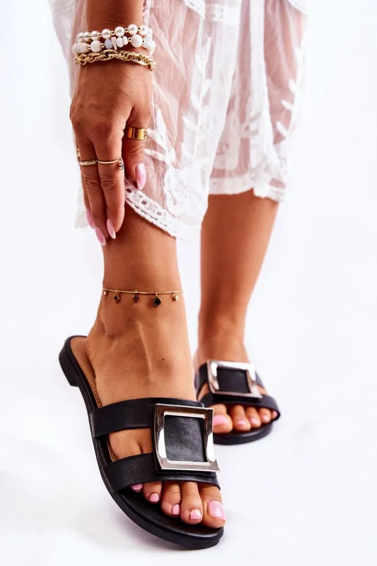 Damskie klapki o klasycznym fasonie. Wykonane z eko skóry. Na przodzie posiadają ozdobny element w postaci kwadratu. Wkładka jest wygodna i miękka, wykonana z eko skóry. Nosek odkryty, zaokrąglony. Klapki osadzone na płaskim obcasie, z podeszwą antypoślizgową. Modne i komfortowe w użytkowaniu – po prostu musisz je mieć. Przy wyborze rozmiaru prosimy sugerować się tabelą rozmiarów.