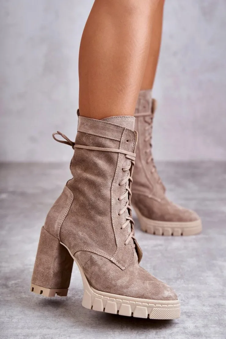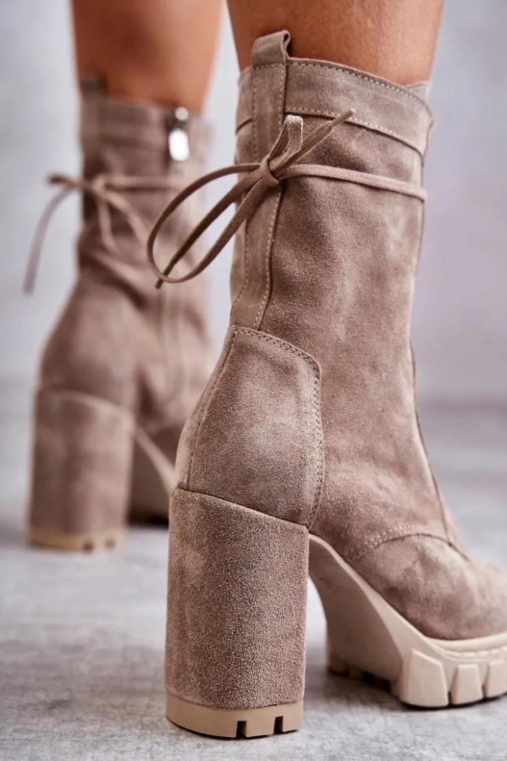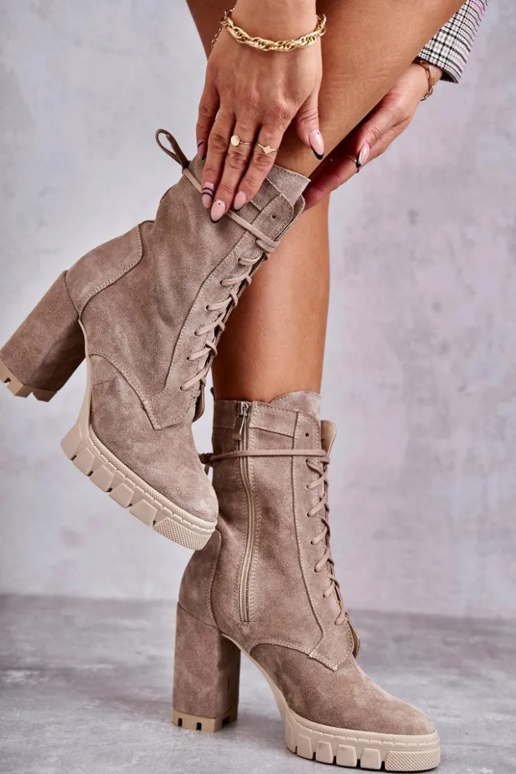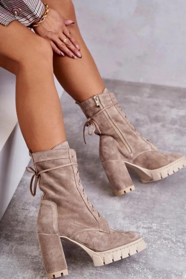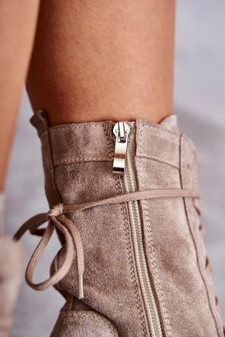 Świetne botki damskie wykonane z naturalnego zamszu. Osadzone na platformie oraz obcasie w postaci słupka. Zapiętek w tych botkach jest usztywniany, co pozwoli na odpowiednią stabilizację nogi. Model ze sznurowaniem i suwakiem na boku cholewki. Wygodna, miękka wkładka wykonana z naturalnej skóry zapewni komfort podczas użytkowania. Przy wyborze rozmiaru prosimy sugerować się tabelą rozmiarów.