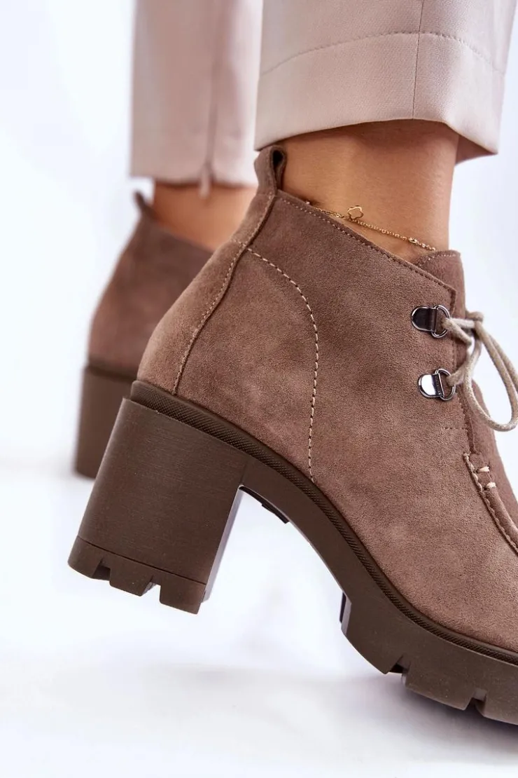 Botki o fasonie trzewików posiadające cholewkę sięgającą powyżej kostki. Gruby, stabilny obcas oraz okrągły nosek. Wiązane na cienkie, okrągłe sznurówki w dopasowanym do obuwia kolorze. Wykonane ze skóry naturalnej. Całość tworzy niebanalny charakter. Botki są ocieplane kocem obuwniczym, z usztywnianym zapiętkiem. Posiadają suwak z boku cholewki ułatwiający zakładanie obuwia. Idealne do wielu stylizacji! Przy wyborze rozmiaru prosimy sugerować się tabelą rozmiarów.
