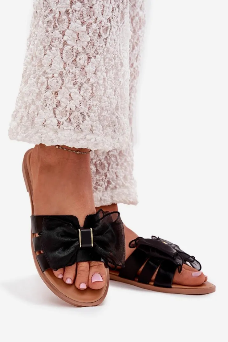 Clearance Boto Klapki Damskie Na Płaskim Obcasie Z Tiulową Kokardą Czarne Tanira