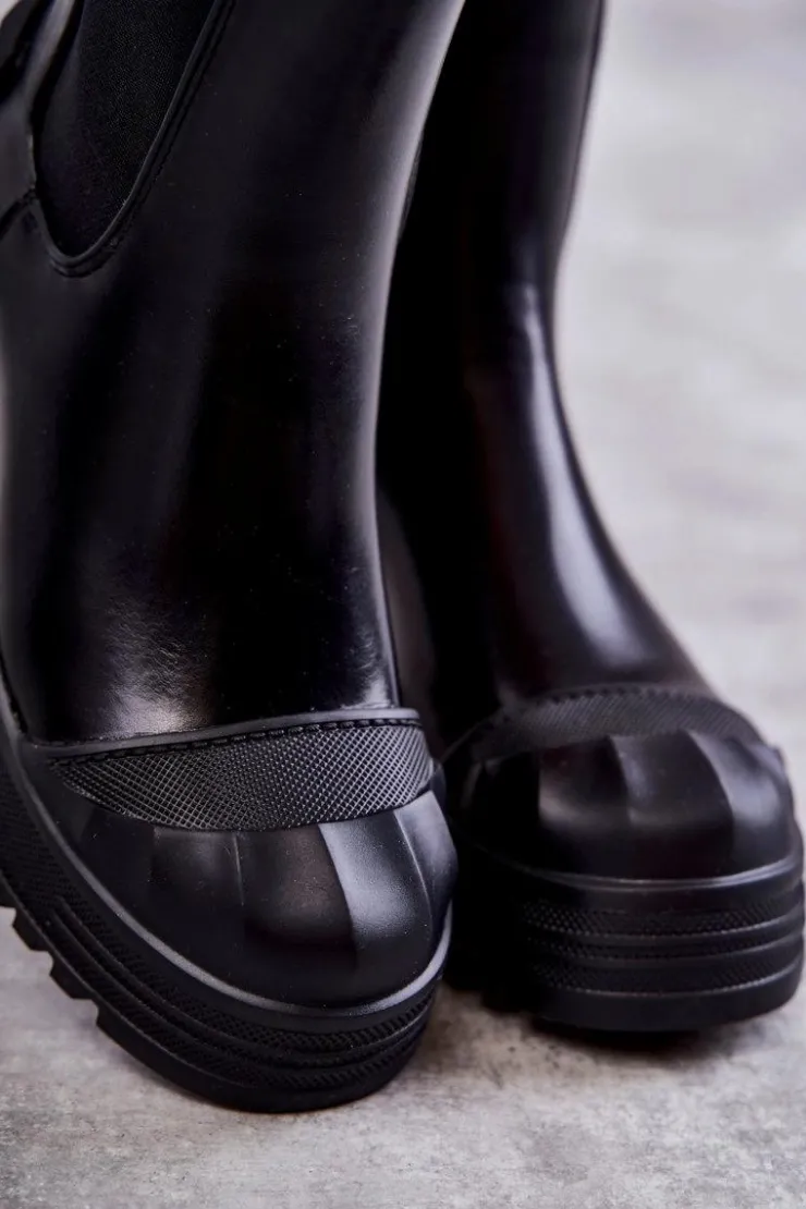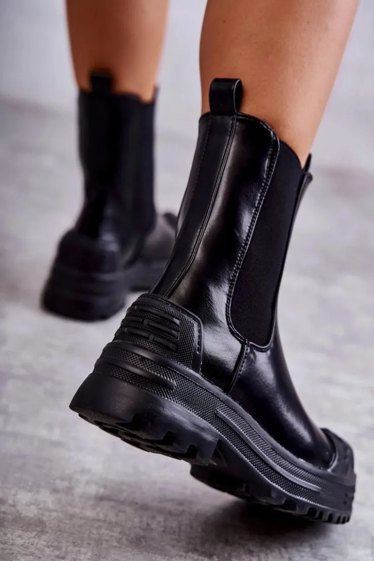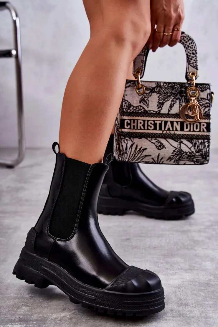 Niezwykłe i stylowe botki damskie zostały wykonane z eko skóry. Model wsuwany. Zapiętek został usztywniony. Na okrągłym nosku znajduje się charakterystyczne wzmocnienie z tworzywa sztucznego. Botki osadzone są na platformie oraz płaskim obcasie. Wkładka materiałowa. Dodatkowo u góry cholewki znajdują się pętelki ułatwiające zakładanie obuwia. Przy wyborze rozmiaru prosimy sugerować się tabelą rozmiarów.