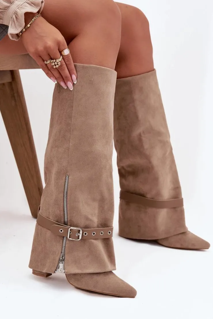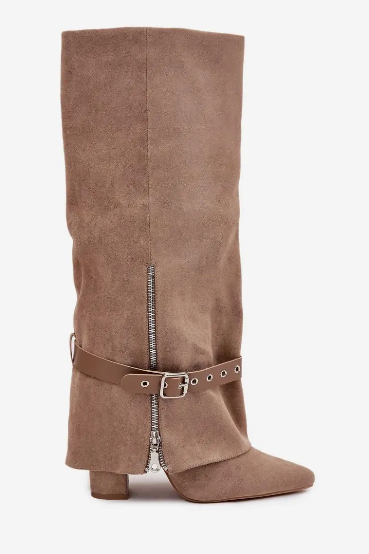 Wsuwane kozaki damskie przed kolano to elegancka i stylowa propozycja, która łączy klasykę z nowoczesnym akcentem. Model ze szpiczastymi noskami i obcasem typu słupek subtelnie wysmukla sylwetkę, a cholewka nachodząca na obcas nadaje całości wyjątkowego charakteru. Dodatkowy pasek z ozdobną klamrą można ściągnąć lub dowolnie ustawić, zmieniając styl butów i dopasowując je do różnych stylizacji. Idealne do sukienek, spódnic, jak i eleganckich zestawów casualowych, wprowadzają modny, kobiecy akcent do każdej garderoby. Przy wyborze rozmiaru prosimy sugerować się tabelą rozmiarów.