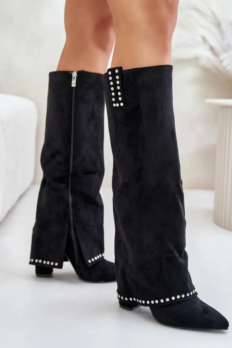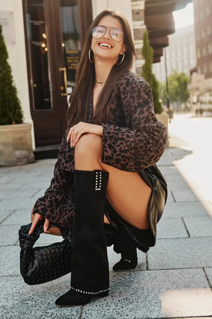 Damskie kozaki z luźną cholewką wykonane z eko zamszu. Osadzone na stabilnym słupkowym obcasie, z noskami w szpic, które dodają wyrafinowanego charakteru. Wnętrze ocieplone kocem obuwniczym zapewnia ciepło w chłodniejsze dni. Wywinięta cholewka, która płynnie przechodzi na obcas, stanowi wyjątkowy element tego modelu. Zapinane na suwak, świetnie komponują się z sukienkami i spódnicami, dodając szyku każdej stylizacji. Przy wyborze rozmiaru prosimy sugerować się tabelą rozmiarów.